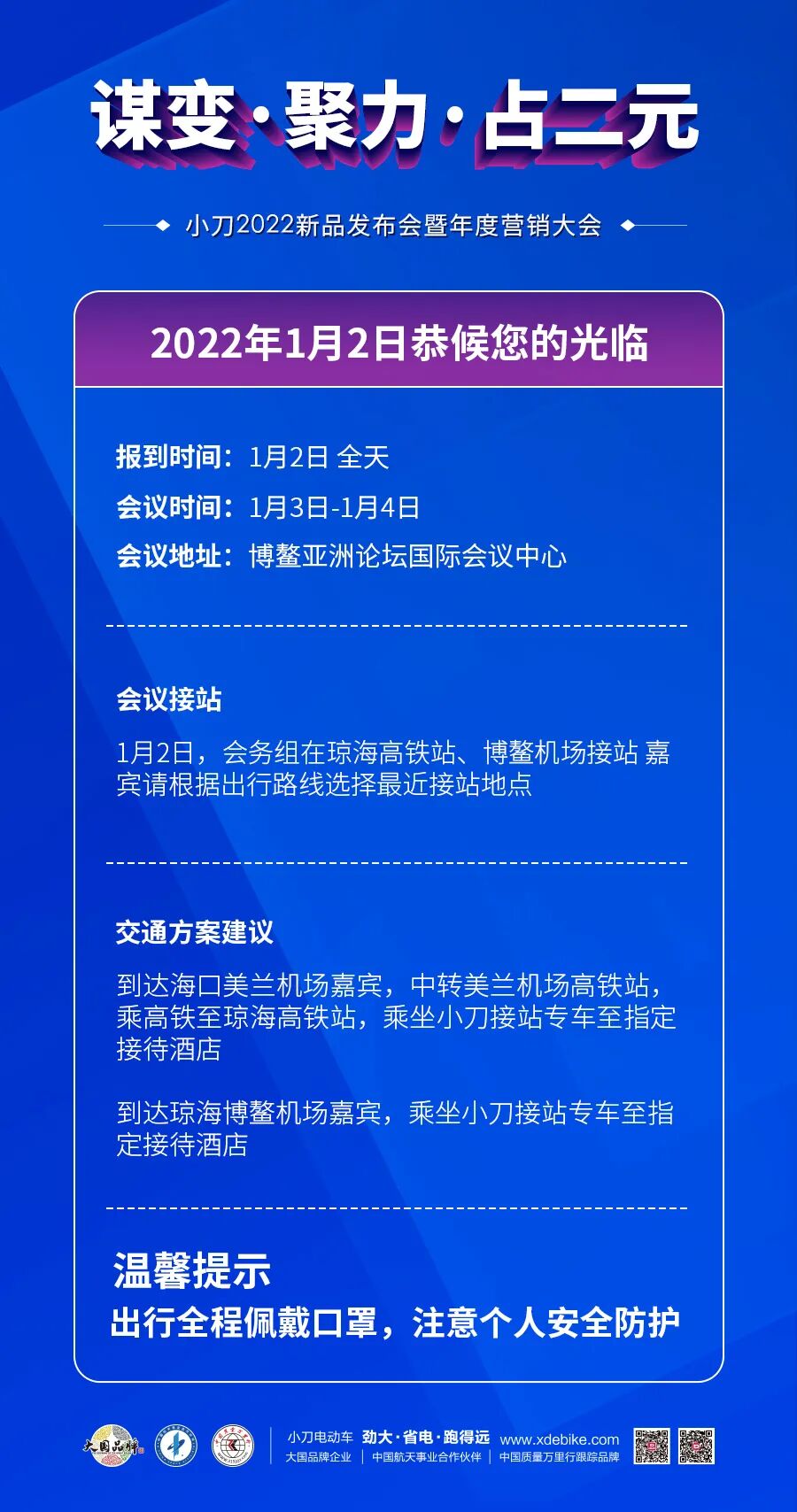 在战略思想统一指导下,小刀爆发了更强大的实力。现有渠道网点优化升级,市场深挖拓展,全力推进社区店开发,开创渠道新版图。在小刀全国众多销售网点中,多名优秀经销商更是脱颖而出,并将于年会现场携手开启小刀最高荣誉殿堂的大门。共同探讨发展新思路、新格局,2022年的小刀将会以什么样的姿态进入发展新阶段,敬请期待!谋变·聚力·占二元——小刀2022新品发布会暨年度营销大会· 【小刀长征版 一次充电400里】参照实验室报告数据。实际行驶里程因骑行条件不同可能存在偏差,以上数据仅供参考;· 本页面所有图片仅用于品牌展示,如有疑问或使用需求,请联系本平台。