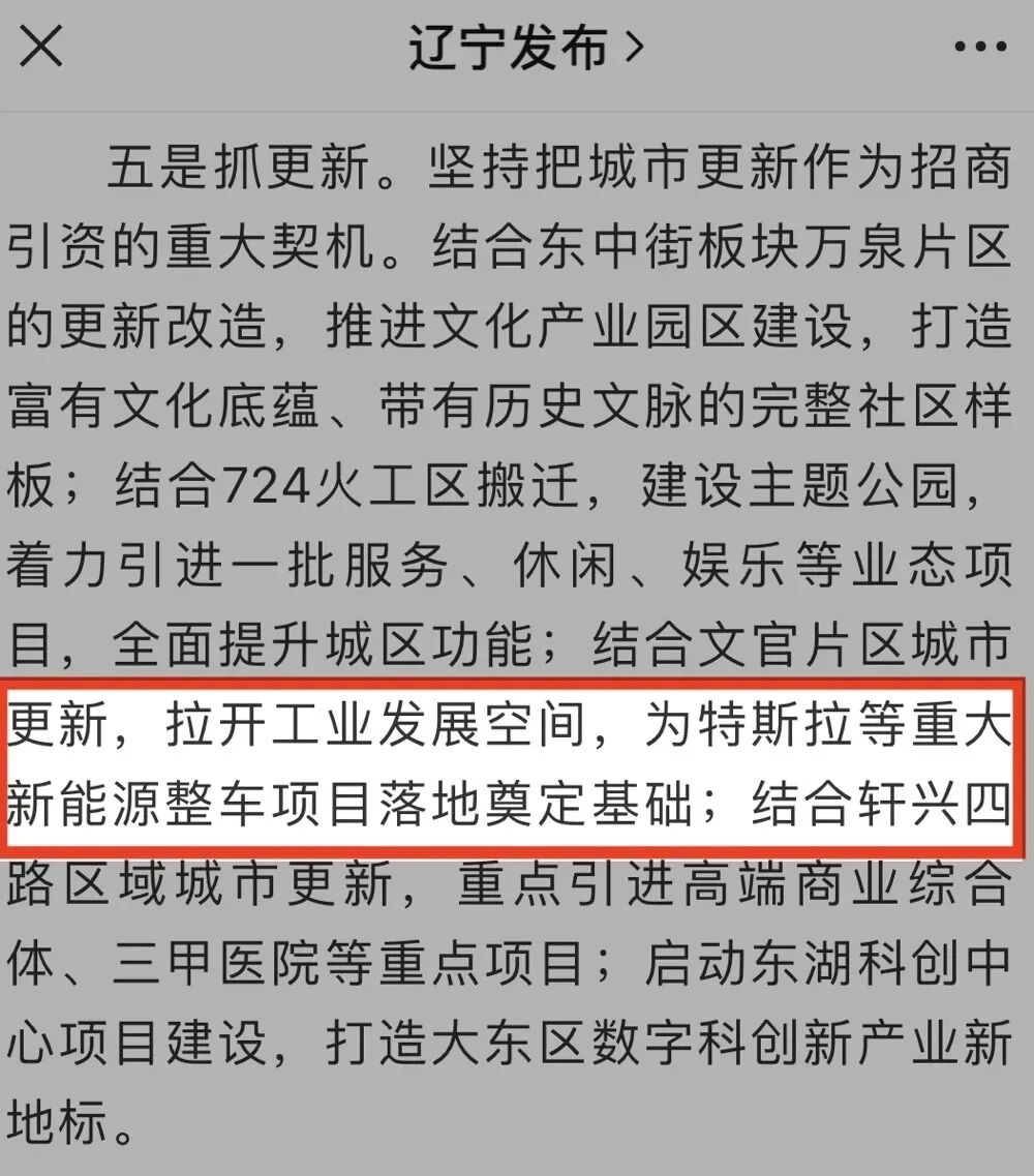 12日,《辽宁发布》在文章中提及,要“结合文官片区城市更新,拉开工业发展空间,为特斯拉等重大新能源整车项目落地奠定基础”。