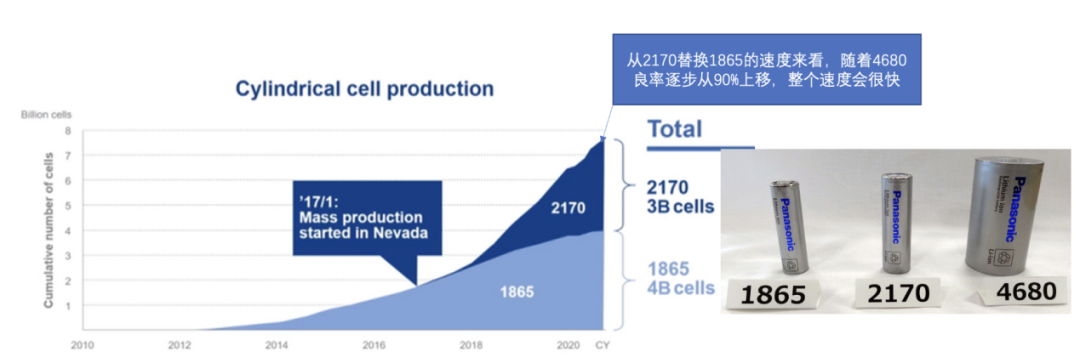 2020年的数据显示,松下生产了30亿个2170电芯,40亿个1865电芯。如果4680按照单台车1000个电芯来算,也就是说特斯拉1万台车,需要1000万个电芯,10万台需要1亿个4680电芯。