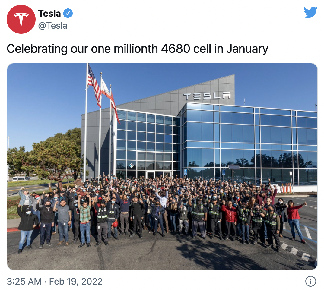 特斯拉在2月19日通过官方社交平台宣布,1月份已生产出第100万块4680电池。