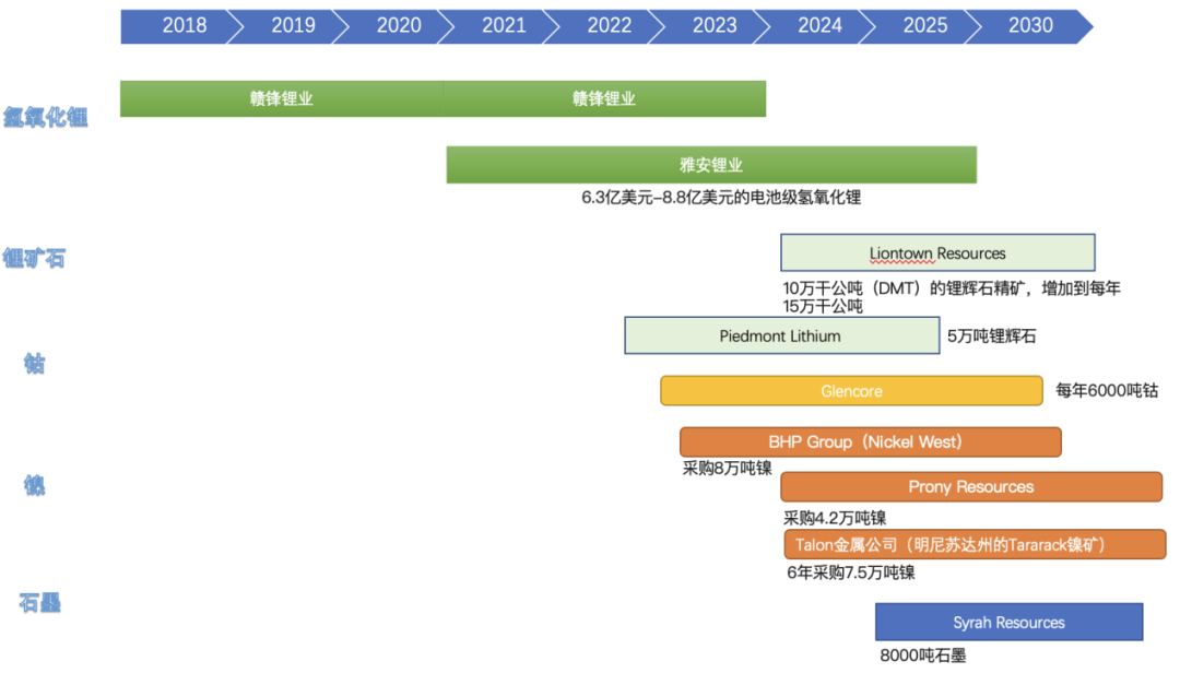 特斯拉目前在做一家电池企业所做的事情——找赣锋锂业和雅安锂业买现在使用的氢氧化锂,在2022年下半年开始购买锂辉石精矿,并且在钴、镍分别找上游锁定资源供应,并且在负极产品上也开始做一轮布局。