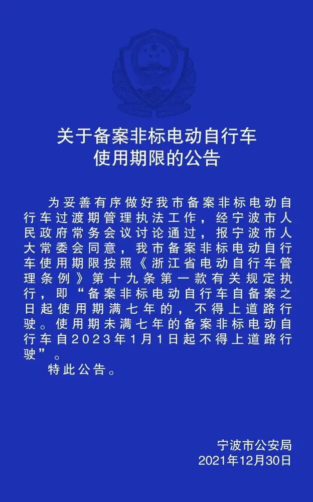 为妥善有序做好宁波市备案非标电动自行车过渡期管理执法工作,经宁波市人民政府常务会议讨论通过,报宁波市人大常委会同意,宁波市备案非标电动自行车使用期限按照《浙江省电动自行车管理条例》第十九条第一款有关规定执行,即“备案非标电动自行车自备案之日起使用期满七年的,不得上道路行驶。使用期未满七年的备案非标电动自行车自2023年1月1日起不得上道路行驶。