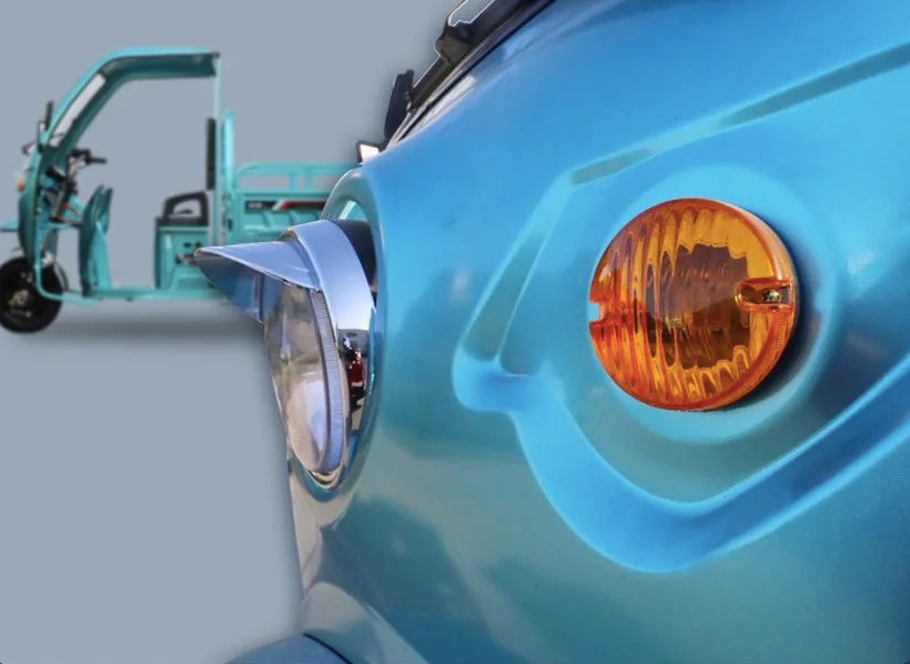 金迪领航整车的外观非常喜庆,当然即便是半封闭的篷车也要有自己的设计语言,前脸造型可以用“浓眉大眼”来形容,与农村人的朴实无华相呼应。该车配置了LED大灯和日行灯,夜间照明效果好,同时配置了可调节的反光镜,实时观测路况信息,相比普通的三轮车更为厚道。
