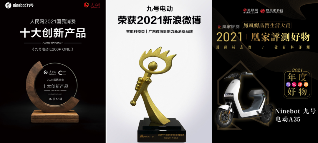 伴随着年底各大颁奖典礼的举行,九号电动凭借旗下智能电动车产品斩获多个业内外重要奖项。其中,E200P ONE获由人民网主办的“2021国民消费大会——年度创新产品奖”,A35获由凤凰网主办的"2021凰家评测年度好物奖",以及九号电动品牌荣获2021年广东微博影响力新消费品牌奖。