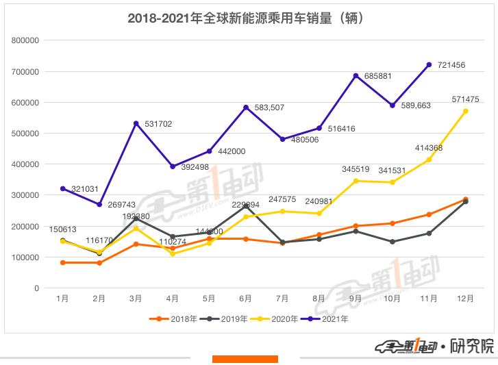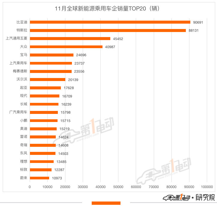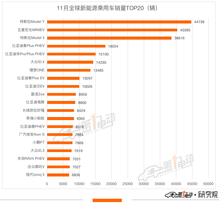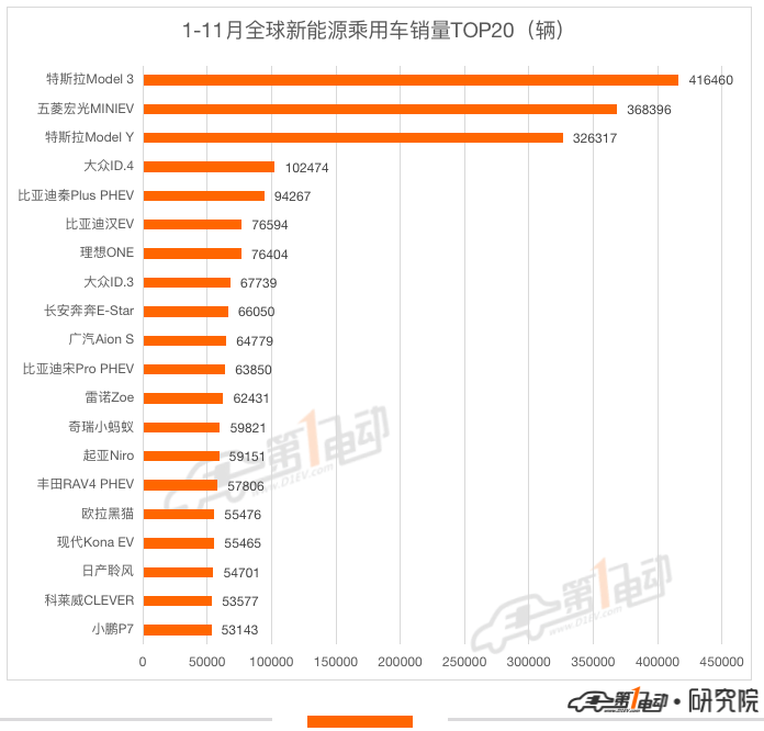 11月,特斯拉Model Y首超宏光MINIEV问鼎冠军,特斯拉Model 3超越秦Plus PHEV,跻身第三。比亚迪宋Pro/Plus PHEV超越大众ID.4,跻身第五。比亚迪海豚、哪吒V首次上榜并跻身榜单第11、第19,小鹏P7、丰田RAV4 PHEV再次上榜跻身第16、第18。科莱威CLEVER、比亚迪元EV、起亚Niro、长安奔奔E-Star跌落榜单。车企方面,比亚迪凭借6款爆款车型,销量突破9万辆,稳坐冠军宝座。特斯拉环比大涨81.4%夺得亚军,上汽通用五菱位居第三。凭借热销车型奇瑞小蚂蚁,奇瑞汽车首次上榜并跻身第16。理想、蔚来再次上榜位居第18、第20。长安、丰田、朋克汽车落榜。根据Clean Technica数据,2021年11月,全球新能源乘用车销量721,456辆,同比大涨74.1%,环比增长22.4%,占整个汽车市场的11.5%,再创历史纪录。其中纯电动车销量51.8万辆,占整个新能源乘用车市的72%,占整个汽车市场的8.3%。2021年1-11月新能源乘用车销量超550万辆,为了达成一年的销量目标,每年年底各大车企都要做年终冲量,预计2021全年的新能源乘用车市场销量将达到650万辆。车型方面,特斯拉Model Y销量44,738辆,环比大涨60.7%,超越宏光MINIEV夺得冠军。特斯拉Model 3销量38,616辆,环比暴涨133.6%,超越秦Plus PHEV位居第三。比亚迪宋Pro/Plus PHEV超越大众ID.4,跻身第五。理想ONE销量13,485辆,环比大涨76.3%,从10月第11跻身11月第七。雷诺Zoe销量8,959辆,环比上涨33.8%,上升7位至第10。现代Ioniq 5销量6,836辆,环比下降5.7%,下降至第20。比亚迪海豚、哪吒V首次上榜并跻身榜单第11、第19,小鹏P7、丰田RAV4 PHEV再次上榜跻身第16、第18。科莱威CLEVER、比亚迪元EV、起亚Niro、长安奔奔E-Star跌落榜单。中国品牌车型占据13席,其中比亚迪车型占6席。五菱宏光MINIEV(第二)、比亚迪秦Plus PHEV(第四)、比亚迪宋Pro/Plus PHEV(第五)、理想ONE(第七)、比亚迪秦Plus EV(第八)、比亚迪汉EV(第九)、比亚迪海豚(第11)、欧拉好猫(第12)、奇瑞小蚂蚁(第13)、比亚迪唐PHEV(第14)、广汽埃安Aion S(第15)、小鹏P7(第16)、合众哪吒V(第19)。1-11月,毫无悬念,特斯拉Model 3、五菱宏光MINIEV、特斯拉Model Y仍然稳居前三。比亚迪秦Plus PHEV的销量正逼近大众ID.4,有望在不久的将来超越后者,跻身榜单第四。我们观察到,前11月的排名与前10月的排名一致,无车型起伏变化。车企方面,比亚迪凭借6款爆款车型,销量突破9万辆,稳坐冠军宝座,特斯拉销量8.8万辆,环比大涨81.4%,夺得亚军,上汽通用五菱销量破4.5万辆,环比微涨6.9%,位居第三。大众、宝马、上汽乘用车、梅赛德斯分列第四、第五、第六、第七。沃尔沃超越现代和起亚跻身第八。凭借旗舰车型小鹏P7,小鹏汽车销量破1.5万辆,环比大涨54.3%,跻身第12,奥迪连降三位至第14。凭借热销车型奇瑞小蚂蚁,奇瑞汽车首次上榜并跻身第16。理想、蔚来再次上榜位居第18、第20。长安、丰田、朋克汽车落榜。在TOP20中,中国企业占据了10席,比亚迪(第一)、上汽通用五菱(第三)、上汽乘用车(第六)、长城(第11)、广汽乘用车(第12)、小鹏(第13)、奇瑞(第16)、东风(第17)、理想(第18)、蔚来(第20)。前11月,特斯拉销量突破76万辆,夺得销量冠军,比亚迪销量超50万辆,获得亚军,上汽通用五菱销量近4万辆,位居第三。长城汽车销量突破11万辆,环比上涨16.5%,超越标致跻身第13,丰田销量突破10万辆,环比微涨9.8%,下降至榜单第16。写在最后:我们越来越清晰地感觉到,中国新能源车的市场份额正在逐渐扩大。11月,TOP20中,中国品牌车型占据13席(车企占据10席)。比亚迪仍然是最大赢家,上榜车型占据6席,比亚迪海豚首次上榜。随着比亚迪第四款搭载DM-i超级混动系统的新车——宋Pro DM-i的上市,比亚迪家族或又将迎来一款爆款车型,届时比亚迪的单月销量将突破10万辆大关。有个不争的事实是,中国的新能源汽车正在带动全球新能源汽车快速向前“奔跑”。![]()