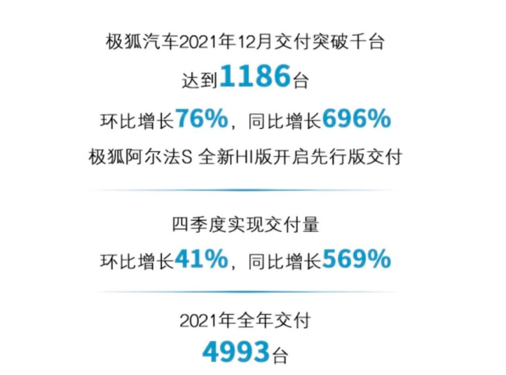 伴随着2022年新能源汽车补贴政策的调整,蔚来汽车也公布了蔚来ET7 最新补贴后售价。其中75kWh标准续航电池包补贴11340元,CLTC综合续航530公里,整车购买价43.666万元。100kWh长续航电池包补贴价格12600元,CLTC综合续航675公里,整车购买价49.34万元。首发版100kWh长续航电池包补贴价格12600元,CLTC综合续航675公里,整车购买价51.34万元。蔚来CEO李斌表示:”苹果大家也都特别关注,它准备这个事已经花了很长时间了,现在大家是觉得它越来越近了,我们也看到产业链有一些公司已经开始在根据他们的要求动起来了,觉得是一件正面的事情,对这个行业本身来说,大家有更多的产品可以选择,单从竞争的角度来讲肯定是更加的激烈,但是我觉得对用户和产业都是有意义的事情。“被问及蔚来的目标是否会是对标苹果,李斌称他们应该也不会推太便宜的车。3. 智己汽车全国首批体验中心开幕 总计上线13家智己汽车全国首批体验中心已盛大开幕。本次开放的体验店共有 13 家,分别位于上海、苏州、杭州、南京、宁波、广州、北京、温州、深圳。智己汽车官方表示,未来智己 L7 Beta 体验版即将到店,顾客可以零距离接触体验,预计今年 3 月初可以开放试驾。4. 极狐汽车12月交付1186台汽车 2021年全年交付4993台1月2日,极狐汽车发布销量成绩单,2021年12月交付1186台汽车,2021年全年交付4993台。四季度实现交付量环比增长41%,同比增长569%。根据思皓新能源的销量海报显示,2021年思皓新能源累计终端交付超过了40000台,其中,12月销量超过7000台。5. 思皓新能源2021年12月销量超过7000台 全年累计终端交付超4万日前,有海外媒体报道,丰田汽车2021财年(2021.4.1-2022.3.31)的全球产量有望超过900万辆的目标,该公司计划在2022年2月和3月提高产量,以抵消新冠疫情引起的生产中断造成的产量损失。根据2021年12月24日的公告,丰田11月在全球生产了82万辆汽车。此前,丰田表示,该公司计划在12月生产80万辆汽车。此外,根据丰田向零部件供应商披露的2022年1月至3月的生产计划,丰田本财年的全球产量可能会达到近920万辆。7. 加大汽车金融服务 小鹏融资租赁公司注册资本增7500万美元企查查APP显示,近日,广州小鹏汽车融资租赁有限公司发生工商变更,公司注册资本由5000万美元增加至1.25亿美元,增幅为150%。企查查信息显示,该公司成立于2018年,法定代表人为夏珩,经营范围包含:租赁业务;兼营与主营业务有关的商业保理业务等,由广东小鹏汽车产业控股有限公司、XPeng(Hong Kong)Limited共同持股。激光雷达制造商禾赛科技和美团达成战略合作,双方将在未来四年内围绕自动配送领域展开深度合作及探索。根据协议,禾赛将为美团自动配送业务长期供应长、中、短距在内的多款激光雷达,推动美团自动配送方案在自动驾驶能力上的进一步升级,实现规模化落地。9. 巨湾技研与天枢能源签署合作协议 三年建设1000座超充站广汽集团孵化企业广州巨湾技研有限公司(简称“巨湾技研”)与盈峰集团子公司广东天枢新能源科技有限公司(简称“天枢能源”)在佛山签署战略合作协议,并发布共建超充网络战略。根据计划,双方将投资超10亿元人民币,在2022年-2024年三年时间内,在国内100座城市,联合共建1,000座超充站。宝马官方发布了宝马iX M60官图。作为宝马iX车系中的最高性能版,宝马iX M60配备前后双电机组成的四驱系统。官方公布的0-100km/h加速时间3.8秒,WLTP最大续航里程575公里。新车将在1月4日开幕的CES消费电子展上正式首发。为专注于新能源汽车的你