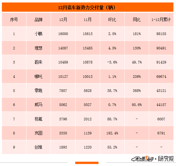 位居第一的小鹏汽车12月总交付量16,000台,同比增长181%。2021年小鹏全年总交付量达到98,155台,为2020年的3.6倍。其中,小鹏P7交付7,459台,全年累计交付60,569台,占全年总交付量的62%。小鹏P5在今年10月开启规模交付后持续爬坡,12月交付5,030台创下新高。小鹏G3系列产品年累计交付量29,721台,同比增长148%。截至2021年底,小鹏汽车累计交付量已超过13万台。随着用户规模持续增长,小鹏汽车加速布局充电和销售服务网络,截至2021年11月底,小鹏已于全国铺开661座品牌超充站,覆盖228座城市,并在全国运营311家销售门店,覆盖121座城市。理想汽车12月交付14,087辆理想ONE,同比2020年12月增长130.0%。2021年第四季度,理想ONE共交付35,221辆,环比2021年第三季度增长40.2%,同比2020年第四季度增长143.5%。2021年1月-12月,理想ONE总计交付90,491辆,同比2020年增长177.4%。自交付以来,理想ONE累计交付量已达124,088辆。截至2021年12月31日,理想汽车在全国已有206家零售中心,覆盖102个城市;售后维修中心及授权钣喷中心278家,覆盖204个城市。12月,蔚来交付新车10,489台,同比增长49.7%。四季度共交付25,034台,同比增长44.3%,实现连续七个季度正增长。蔚来2021年交付新车91,429台,同比增长109.1%,连续两年翻番。蔚来车辆累计已交付167,070台。2021年,蔚来体系竞争力快速发展:先后发布智能电动旗舰轿车ET7和中型智能电动轿跑ET5;为ES8、ES6和EC6用户提供6次FOTA升级。在全球建成换电站778座,新建超充桩和目的地充电桩共计4,582根;发布二手车业务;新建成NIO House15座,服务中心72家;NIO Life发布594件新品;蔚来App进行了16次版本更新;全球市场方面,蔚来发布挪威战略,正式以全体系落地的方式进入挪威市场。2022年,蔚来将交付三款新车型;位于NeoPark新桥智能电动汽车产业园区的蔚来第二生产基地将于第三季度正式投产;全球范围内,产品与全体系服务将在德国、荷兰、瑞典、丹麦落地。![]()