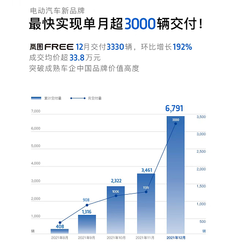 极氪ZEEKR 001共交付3,796台,环比增长88.7%。自2021年10月23日启动交付之后,极氪每月的交付量都在大幅增长。就在12月31日,极氪中心全球旗舰店在上海正式落成。目前,极氪中心、极氪空间以及极氪交付中心已经覆盖了多个一、二线城市,线下渠道覆盖越发广泛。极氪能源自建充电站,已在包括北京、上海、广州、深圳等在内的全国14座城市上线;极氪充电地图持续接入全国主流运营商,第三方充电网络已覆盖全国326座城市的27万多个充电终端。电极送帮充电服务,已上线30城,充电车服务在北京、上海、杭州3城完成布局。岚图汽车12月交付3,330辆岚图FREE,环比增长192%。自2021年8月启动交付,岚图连续五个月实现环比上涨,累计交付6,791辆岚图FREE,成交均价超33.8万。岚图汽车最新公布的产品规划显示,2021-2022年,岚图汽车将形成跨SUV、MPV、轿车的三大品类矩阵,每年至少向市场投放一款新车,不断扩展高端电动汽车品牌的产品阵容。2021年,岚图汽车在全国开设43家岚图空间,覆盖24座城市。预计2022年,岚图空间将增加到105家覆盖48座城市,交付服务中心增至40家覆盖40座城市,官方授权的钣喷中心将覆盖51座城市。还表示,为了满足用户尽早提车的需求,随着2021年12月产能提升,岚图汽车将提车周期缩短至1个月内,1月10日前下定岚图FREE的用户,春节(2月1日)前可提车。创维汽车12月全球总交订量为3,409台,环比增长179.4%。其中,国内交订量为1,893台,海外交订量为1,516台。除此之外,创维汽车的体验中心也已经达到158家。创维汽车EV6于2021年7月上市,该车共推出4款车型,补贴后售价15.28万-24.98万元。此外,旗下EV6-600+和EV6-HTi(智混版)目前也已开启预售,分别将于明年一季度、二季度上市。此前,创维汽车强调1-3-3-3战略并明确销售目标:2025年创维汽车年销售实现25万台,2030年实现销售50万台。写在最后:2022年小鹏汽车即将交付旗舰 SUV G9,P7 可能也会迎来改款;蔚来将实现三款NT2.0车型的交付,包括 ET7、ES7(传闻)以及ET5;理想新旗舰车型X01也将上市,定位高端智能电动车的哪吒S也将于今年上市;威马M7、阿维塔11、沙龙汽车机甲龙、智己L7、飞凡R7......传统车企的多款车型也将陆续上市。可以想象的是,2022年造车新势力们的竞争将更加激烈。![]()