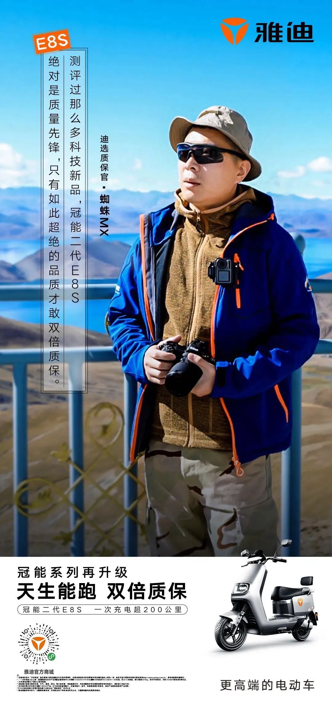 迪选质保官“蜘蛛MX”表示,测评过那么多科技新品,雅迪冠能二代E8S绝对是质量先锋,只有如此超绝的品质才敢双倍质保。