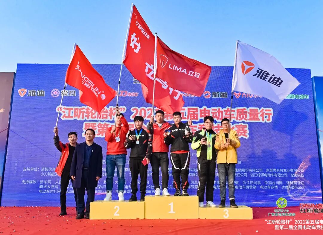 11月18日,“江昕轮胎杯”2021第五届电动车质量行&第二届全国电动车竞技大赛今天在江苏邳州正式启动。立马、雅迪、爱玛、台铃、小牛、绿源、新蕾、金箭、小刀9家电动车行业品牌同台竞技,共同角逐赛场。本次赛事历时15天时间,9支车队将横跨江苏、安徽、浙江、福建、广东五省,骑行里程超千公里,经历包括测试车辆性能、爬坡动力、长距离续航、越野赛道等多种竞技赛事。下午1点,比赛在邳州沙沟湖水杉公园正式拉开序幕,本次赛道全长3.2公里。电摩组、电轻摩组按组别依次竞技,以一圈定胜负。随着口哨吹起,赛车手冲锋向前,开始正面角逐。经过紧张刺激的“争夺”后,立马车手邓晟、班林山分别夺得电摩组冠亚军;程理想、郭悦霆分别摘得电轻摩组第一、第二名。