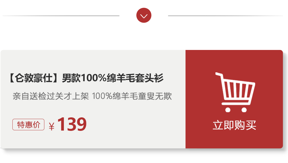 139元啊朋友们!一件棉T的价格现在可以买到一件100%羊毛衫!同步上架的男士款(三种领口可选),限时清仓价同样只要139元。价格一样,品质自然也保持在同一水平线:100%绵羊毛,毫无水分。![]()