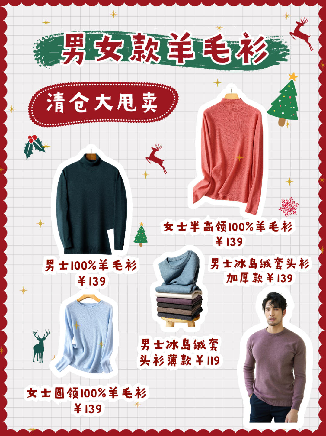 坦白讲,这次清仓我们也是真的是干净利落地将价格压得直逼成本。男女士100%纯羊毛衫只要139元,这价格真的挖遍全网也难找。![]()