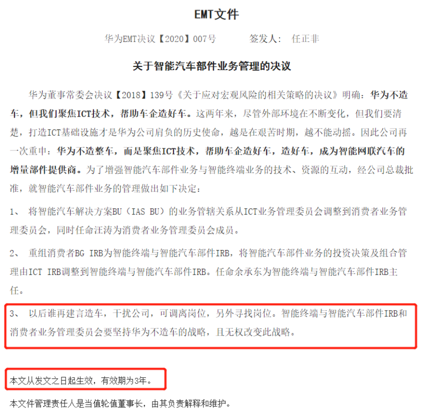 2020年11月华为发布的智能汽车部件业务管理EMT文件中,任正非表示:“以后谁再建言造车,干扰公司,可调离岗位,另外寻找岗位。”