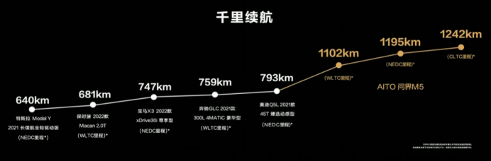 “无论是WLTC、NEDC、CLTC续航,问界M5都超过1100公里,可以秒杀市面上同级别的纯电动和燃油车!注意,纯电动车在冬天续航要打5折,而我们的都是真实续航。”