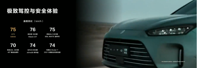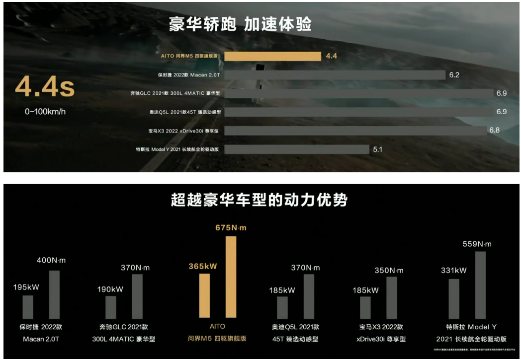 “问界M5的动力性能非常强劲,0-100km/h加速时长达到了4.4s,秒杀同级别车型!另外0-50km/h加速时长只有1.9s,可以弹射起步!”(Ps:没进“三秒俱乐部”实在是有点可惜,但拿0-50km/h这个数据来宣传,emmmmm......)