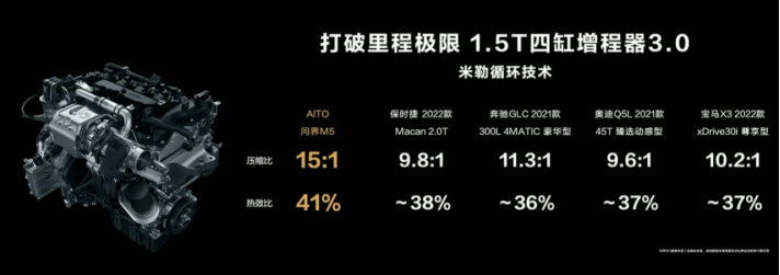“我们的增程器用的是行业领先的1.5T四缸发动机,热效比高达41%,碾压保时捷和BBA。”(Ps:混动专用发动机热效率确实要更高一些,但拿去和普通发动机比热效率,还专挑德系不挑日系,这就有些“不讲武德”了,怎么不拿DM-i的43.03%和吉利雷神动力的43.32%来比呢?)