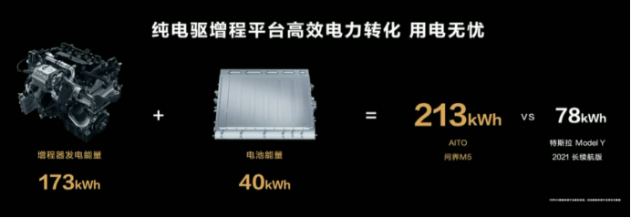 “问界M5的油箱有56L,汽油通过增程器可把油转化为173度电,再加上动力电池中的40度电,总电量达到了213度电,是特斯拉Model Y长续航版的3倍!”(Ps:头一次见这么算电量的。)