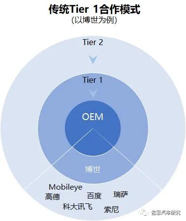 而ET5这款车,无论是从价格还是定位来看,犹如Model 3对特斯拉一样意义重大。——如果ET5能成为爆款车型,那就意味着蔚来将会击破社会上对它产品上的最后质疑(蔚来是不是造车不行服务来凑),而接下来蔚来面对的只是换电体系能否长期运转(盈亏平衡)的问题了。李斌在NIO Day上之所以高调地让ET5以2个“3”为目标,不是因为他要搞“噱头营销”,吸引社会上的眼球。而是蔚来经过了这2年的积累,成长后,内部“与众不同”的基因方才显露出来——那就是蔚来等品牌创造的新造车体系。讲述蔚来的体系之前,我们先俯瞰一下ET5、Model3和宝马3系所在的市场:我们知道的是,BBA这些老牌车企在汽车市场耕耘已久,其中无论是技术壁垒,还是品牌壁垒,都是后来者难以企及的,哪怕是同样老牌车企凯迪拉克、沃尔沃这样的二线豪华品牌,也从未在国内撼动BBA的基本盘市场。虽然大家都在说特斯拉产品给力,价格给力,品牌方面更是因为“从上往下”的策略而在新能源这块领域中成功重置了消费者对汽车品牌和产品的认知,但更为本质的则是特斯拉在体系上,就和传统的车企完全不同。BBA、丰田大众这些传统车企,在造车层面上,他们会把很多总成、子系统的研发交给Tier1供应商,而这些Tier1供应商则会进一步把原材料、零部件的研发交给Tier2供应商,它们这样造车已经十几年甚至上百年了。