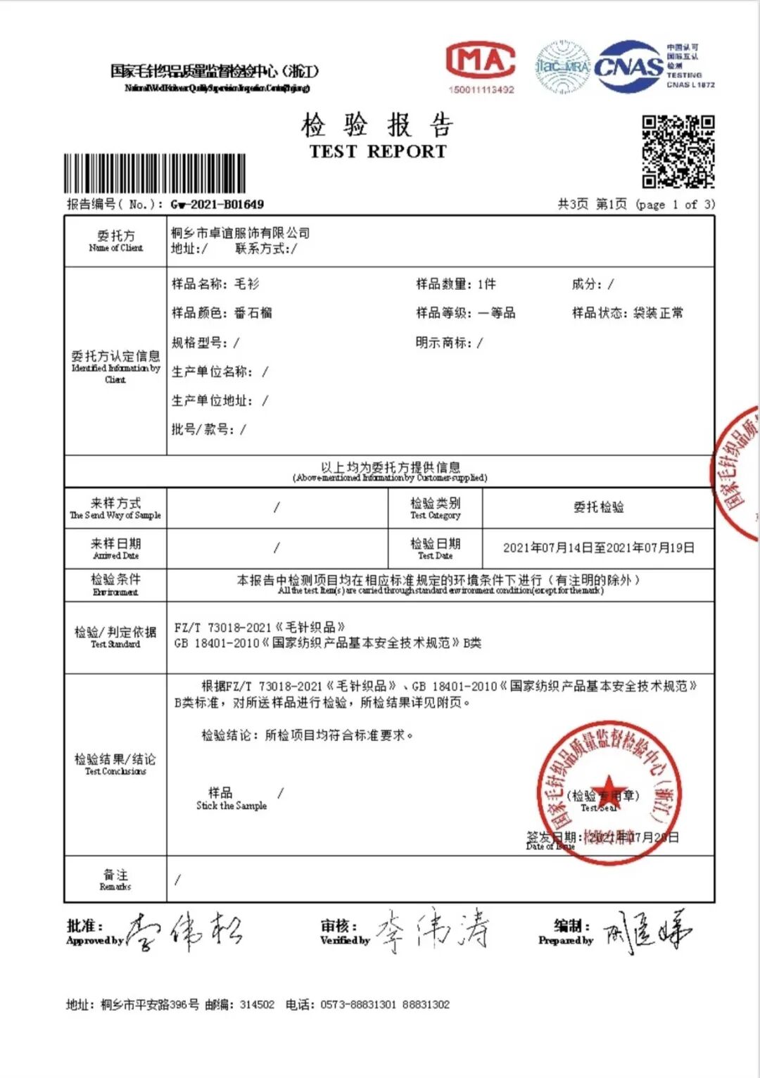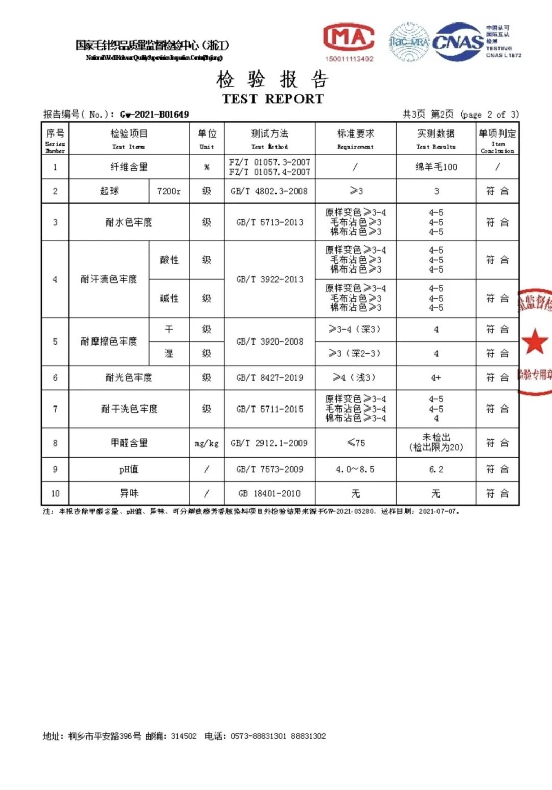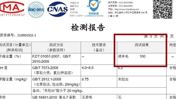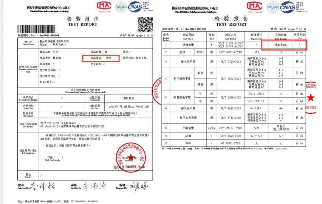 附上检测报告,每一款都经过专业机构检测,认证的100%羊毛含量: