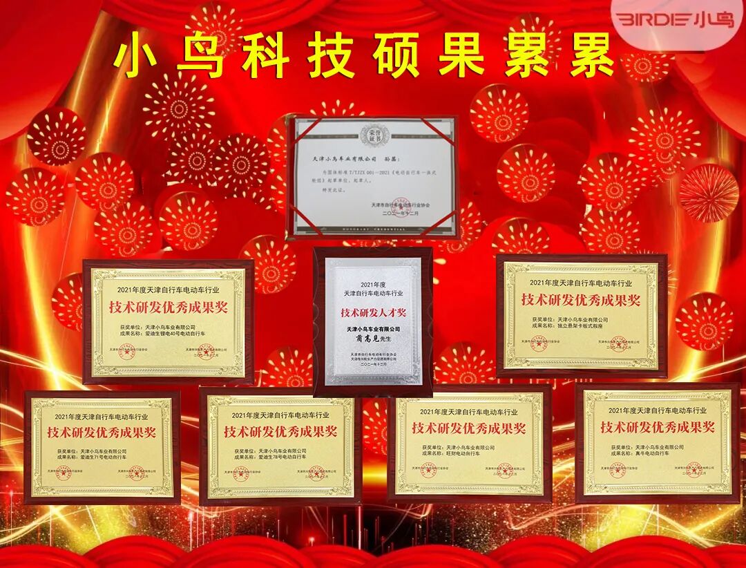 会上,小鸟创新专利产品一举囊获6项“技术研发优秀成果奖”,并获“行业团体标准T/TJZX001-2021《电动自行车一体式轮组》起草单位”,以及两项行业协会专家聘书、一项“技术研发人才奖”,满载而归。![]()