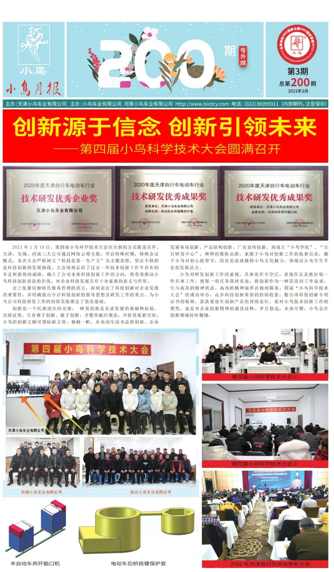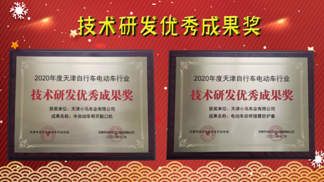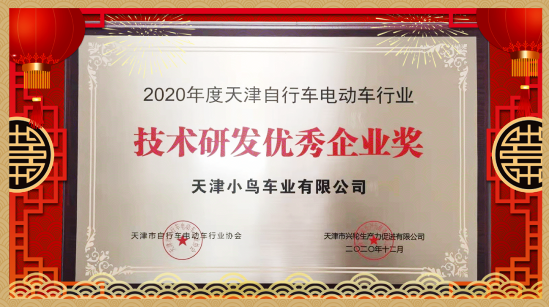 天津市自行车电动车行业协会主办的“天津市自行车电动车行业协(商)会第六(三)届七次会员代表大会暨 2020年行业科技创新大会”在天津隆重召开。小鸟作为科技创新标杆企业,被大会授予“技术研发优秀企业奖”和两项“技术研发优秀成果奖”多项荣誉。彰显了小鸟永在高端的驰名地位,树立了中国电动车一流的品牌形象。