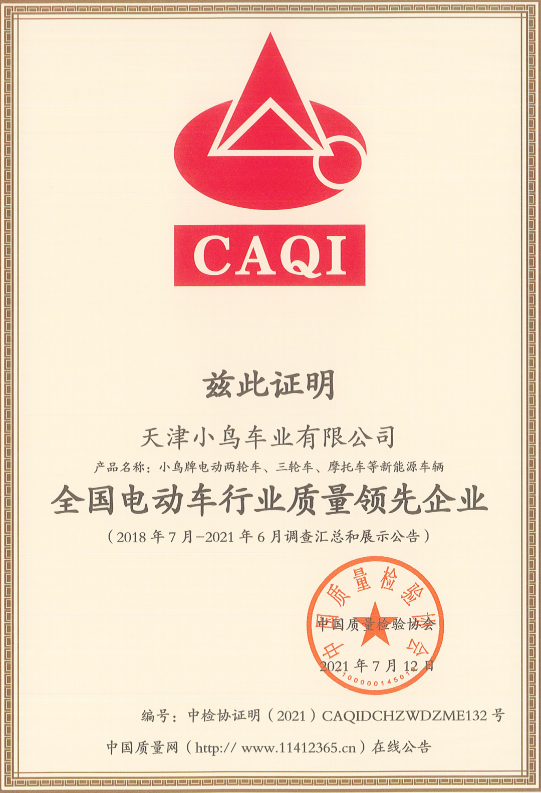 中国质量检验协会为天津小鸟车业有限公司颁布了“全国电动车行业质量领先企业”、“全国电动车行业质量领先品牌”、“全国质量检验稳定合格产品”、“全国质量信得过产品”四大荣誉证书。小鸟“全国电动车行业质量领先”已是第十一年,由此可见小鸟品质坚如磐石!稳如泰山。