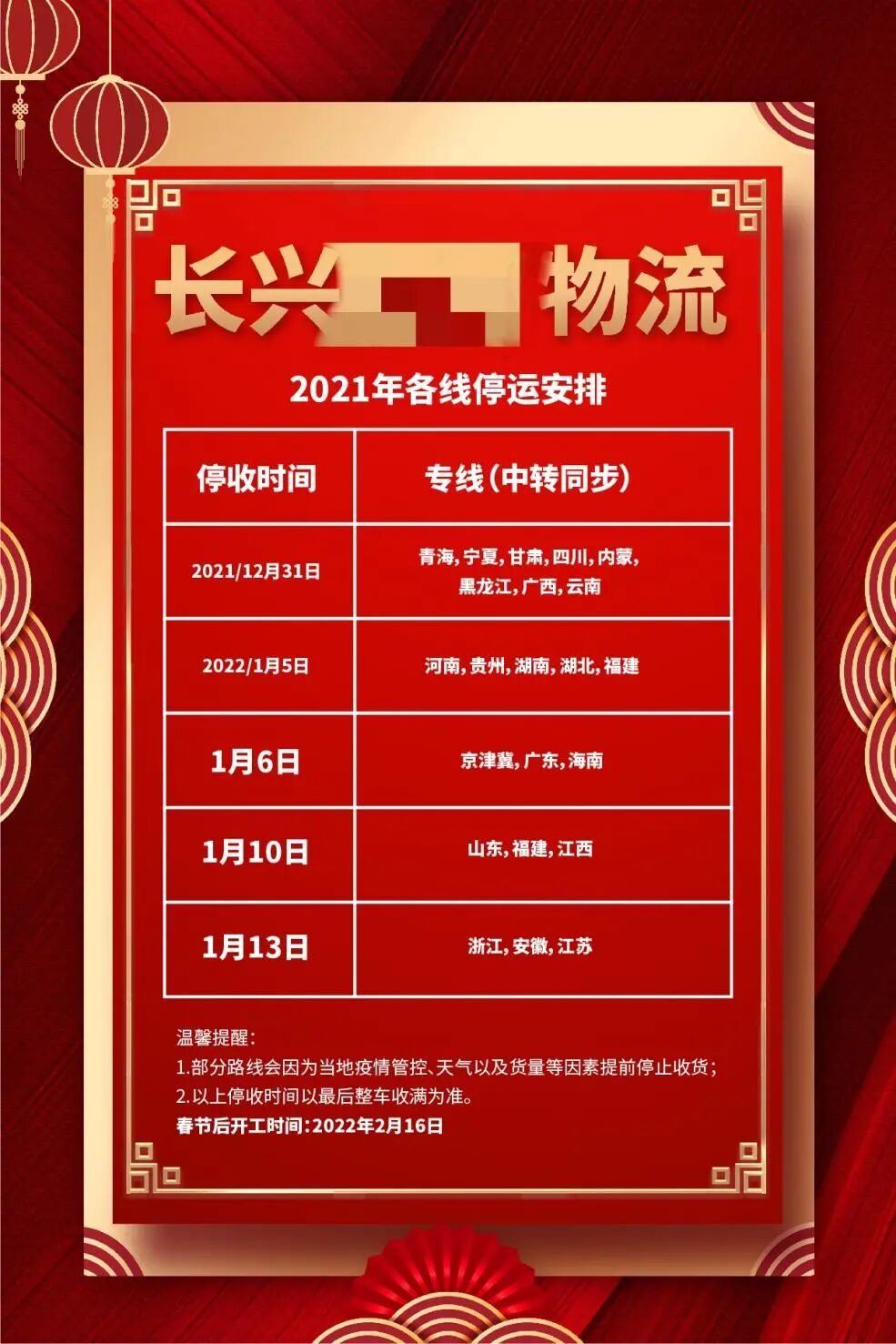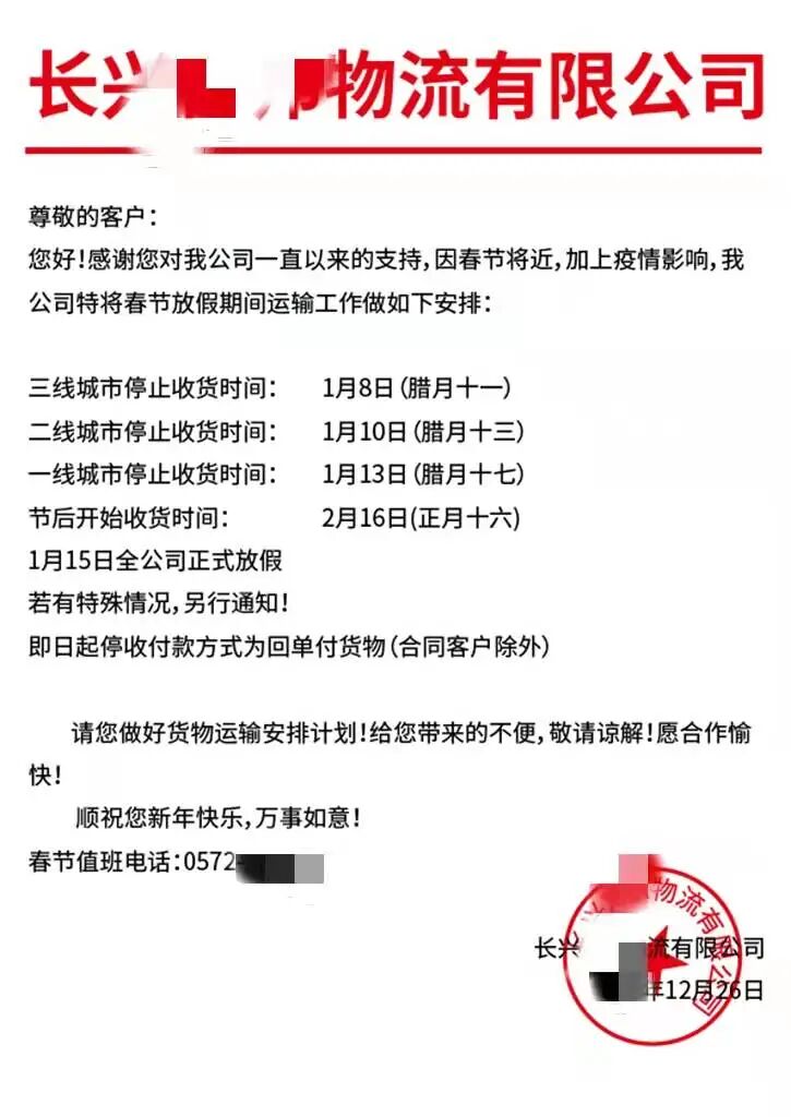 据悉,近期多个物流公司发布了河北、山东、江苏、湖北、湖南、上海、安徽、内蒙古等27个省份地区春节期间物流停运通知,全国物流停运时间已经基本确定: