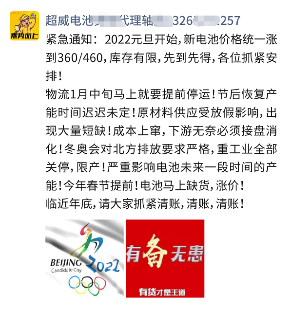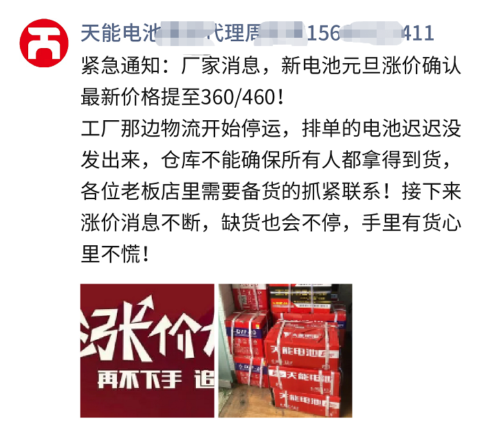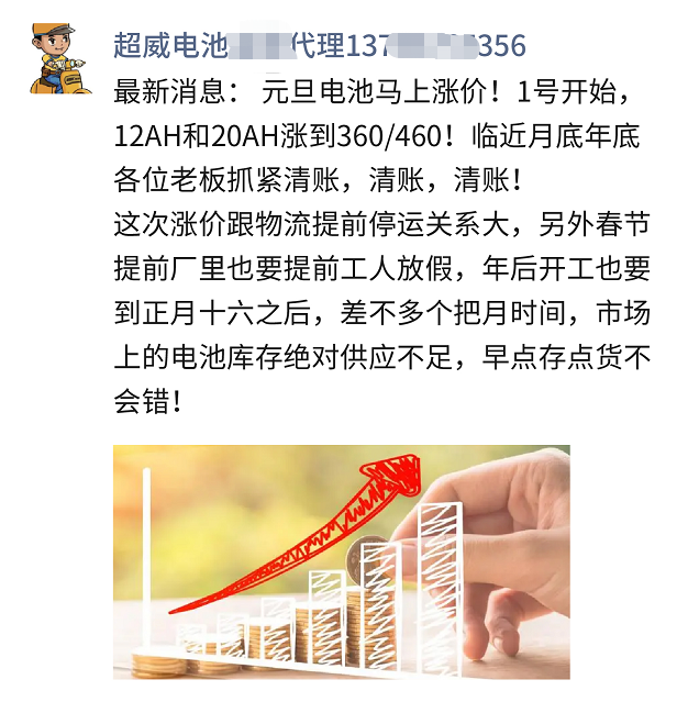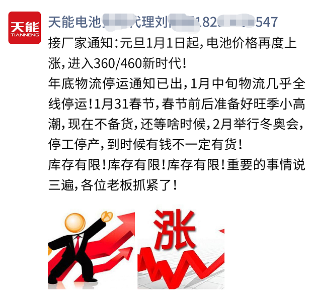 刚刚,据市场一线消息:元旦开始即1月1日起,电池价格再度上涨,进入360/460新时代!广大行业终端是时候备货过节了!