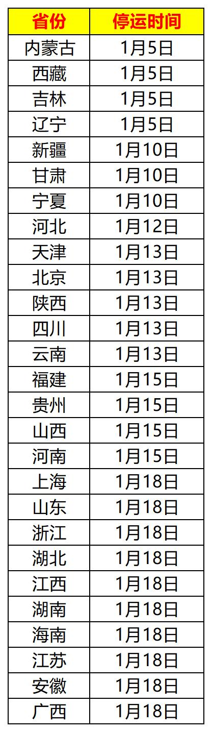 内蒙古、西藏、吉林、辽宁等地1月5日停运;新疆、甘肃、宁夏等地1月10日停运;河北1月12日停运;天津、北京、陕西、四川、云南等地1月13日停运;福建、贵州、山西、河南等地1月15日停运;上海、山东、浙江、湖北、江西、湖南、海南、江苏、安徽、广西等地1月18日停运。