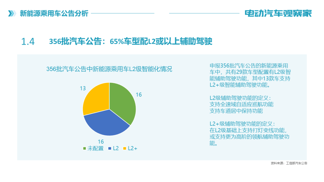 356批《公告》中新能源汽车共计280款,其中乘用车45款。新能源乘用车中,采用磷酸铁锂电车的车型占比超过50%,具备L2或以上水平的新车占比超过65%。