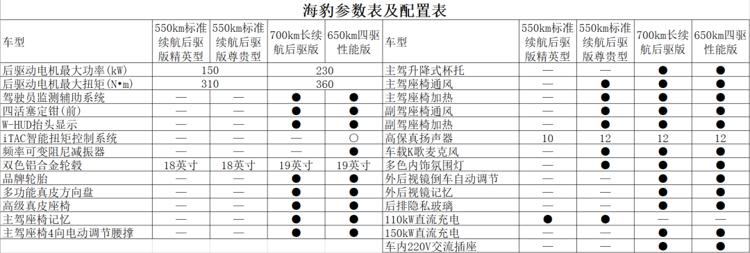比亚迪海豹自从发布亮相之后就受到了很高的关注度,相信很多用户已经对于海豹车型有了一定的认识,接下来小编就为大家再次简单介绍一下比亚迪海豹的基础信息~比亚迪海豹的长宽高分别为4800/1875/1460mm,得益于比亚迪e3.0平台加持,海豹的前后悬都很短,因此轴距达到了2920mm,同时海豹还是比亚迪首款基于后驱打造的轿车车型。比亚迪海豹的风阻系数仅为0.219Cd,是目前比亚迪所有车型中风阻系数最低的。外观方面比亚迪海豹前低后高,整个车身形成一种运动俯冲的感觉。在充分保留了概念车Ocean-X的一些造型元素,采用了全新的海洋美学设计理念。前脸造型比较有视觉冲击力,大灯组下方延伸出来一条“眼线”,辨识度非常高,顺便一提,这条“眼线”其实是海豹的转向灯设计,点亮后的视觉效果很醒目。海豹引擎盖上隆起的线条十分明显,更加突出整车运动风格的定位,看起来颇有力量感。令人惊喜的是海豹前机盖下隐藏有一个前备箱,储物能力大大增强。侧面来看,比亚迪海豹的车身线条呈现向前俯冲的架势,流线型十足。短小的车尾配合上前后短悬的设计,运动气息拉满。标配18/19寸轮毂,造型多样可选,隐藏式门把手也没有缺席。遗憾的是为了更好的NVH表现,海豹没有使用无边框车门设计,否则可能会吸引更多年轻人的目光。尾部海豹的贯穿式尾灯与前大灯造型相互呼应,点亮效果非常美观科幻。小鸭尾搭配车底扩散器造型设计,更加凸显整车年轻运动化风格。相较于外观的亮眼设计,比亚迪海豹的内饰则能看到很多现款车型的影子。10.25英寸悬浮式液晶仪表与15.6英寸中控屏的组合设计,无论是视觉效果还是实际使用体验,都在同级别车型中属于上乘。中控台部分的设计也是目前海洋系列车型常用的设计风格,多线条的布局看起来十分灵动,相比海豚的活泼,海豹的内饰设计拿捏的恰到好处。三电系统方面,两个标准续航版车型采用了150kW的后驱单电机,零百加速7.5秒。搭载了61.4kWh的刀片电池,CLTC续航里程为550km。长续航版车型则采用了230kW的后驱单电机,零百加速5.9秒。搭载了82.5kWh的刀片电池,CLTC续航里程为700km。四驱性能版车型搭载了前160kW异步电机,后230kW同步电机,零百加速仅需3.8秒,同样配备了82.5kWh的刀片电池,CLTC续航里程为650km。比亚迪海豹首次搭载前双叉臂、后五连杆独立悬架。经过专业调校后,在悬架运动过程中能够保持车轮精确的定位参数和抓地性能,减少转弯过程中的侧倾,为驾驶者带来更丰富的驾驶乐趣,显著提升车辆的操控稳定性和舒适性。此次比亚迪海豹预售发布会的重点就是比亚迪发布了CTB电池车身一体化技术及iTAC智能扭矩控制技术,这两项技术都是首次运用于比亚迪e3.0平台的量产车身上。海豹的CTB技术以蜂窝结构为灵感,将刀片电池包上盖与传统结构的车身底板集成,构成上盖、“刀片电池”、托盘的整车三明治结构。动力电池的系统体积利用率提升至66%,系统能量密度提升了10%。CTB电池系统既是能量体,也是结构件,海豹的车身扭转刚度也因此受益,达到40,500Nm/°,媲美百万级豪车,拓宽了操控极限,为整车舒适性、NVH性能提供了优秀的平台。CTB技术还具有更好的空间使用效率,相比传统结构,海豹在车内空间净高相同的前提下,车身高度降低了10mm,整车造型更加低趴,提升了空气动力性能和视觉效果。比亚迪海豹首次搭载iTAC智能扭矩控制技术,该技术改变了过去只能通过降低动力输出让车辆动态恢复稳定的方式,升级为扭矩转移,适当降低扭矩或输出负扭矩等多种控制方式来维持车辆稳定。iTAC在轮速传感器的基础上,增加了电机旋变传感器。相比单独依靠轮速传感器,iTAC的识别精度提高300多倍,可提前50毫秒以上预测车轮转速变化趋势。当轮端出现异常,但尚未出现打滑时,系统就已识别到抓地力异常,提前调整轮端扭矩匹配,让车辆恢复稳定。在小编看来比亚迪汉EV虽然性能同样充沛,但是汉EV与海豹相比明显更加偏向于家庭需求。打个比方来说汉EV的用户画像更像是那些对于性能有最后倔强的中年汉子,绝大多数情况下要顾及家庭的需求,但是心中依然充满了对于性能的希望。而海豹则是以更加小巧的车身尺寸,更加年轻化的外观设计以及后驱大马力来彰显自身年轻运动化的特点,它的用户画像更像是二三十岁充满激情,对于性能有纯纯渴望的青年。综上所述比亚迪推出海豹车型可以说是一种全新的尝试,e3.0平台、后驱/四驱、CTB以及iTAC等技术的综合赋能,让海豹注定成为一辆偏向操控的驾驶者之车,这在比亚迪品牌车型上尚属首辆。通过咨询比亚迪官方人员,海豹将于6月初正式上市,至于比亚迪海豹的交付时间,目前比亚迪官方尚不能给出明确答复,只是说四季度之前有望开始交付海豹。海豹低配版本会不会排产?标准续航版和长续航版只有续航差别吗?比亚迪官方回复低配版车型会进行排产,可以放心预订。