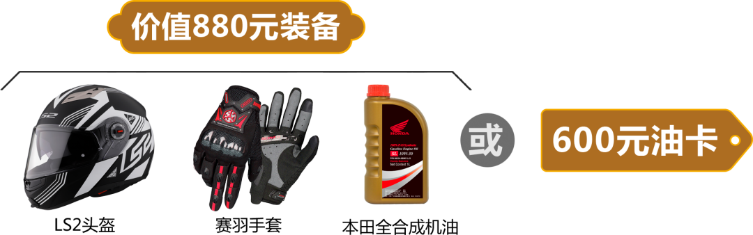 装备内含:LS2头盔、赛羽手套、本田全合成机油