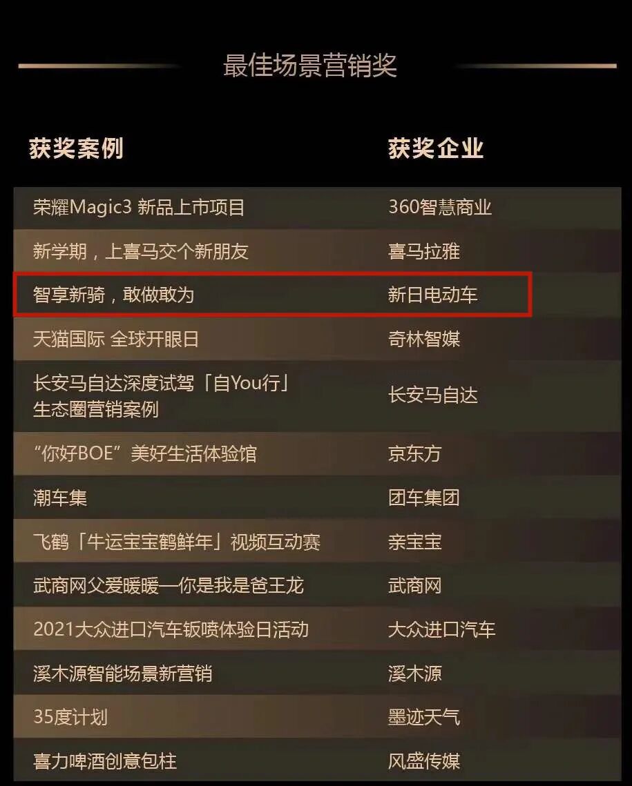 历时2个月的激烈评审,新日凭借“智享新骑·敢做敢为”打卡校园活动,从数百个知名企业中脱颖而出,获得“最佳场景营销奖”。从2006年至今,金瑞奖已经举办了16届,见证了营销领域的每一次聚变和飞跃,被誉为营销届的“风向标”,是营销领域最重要、含金量最高的奖项之一。在激烈的竞争中斩获“最佳场景营销奖”殊荣,意味着新日品牌营销实力受到了市场及业界的广泛认可,为行业树立了品牌年轻化的榜样与标杆!伴随着中国主力消费人群的不断年轻化,中国的制造业在近年来都在大力推进在产品设计、品牌风格、营销路线等各个领域的年轻化转型。新日“智享新骑·敢做敢为”打卡校园活动,采用更符合Z世代气质的快闪形式,打造出一所科技与梦想相互交融的“新骑大学”,在校园市场开展精准场景营销。这次活动不仅刷爆了全国各大高校大学生的微博和朋友圈,收获了数百万年轻人的聚焦与关注,还成功登上微博热搜,彰显超强的品牌号召力。新日校园打卡活动,改变了行业过去的传统营销方式,真正落地在校园,用沉浸式体验方式,去与年轻用户互动,实现了在大量年轻群体中的同频曝光,成功树立行业品牌年轻化的新标杆,获得“最佳场景营销奖”,实至名归!要获得年轻人的芳心,仅仅掌握“年轻态”的传播方式还不够,产品是占领年轻市场的根基。例如“智享新骑·敢做敢为”打卡校园活动中的产品主角XC3,极高的产品颜值,与众不同的智能化,以及新日对未来电动车的产品理念,都在XC3上得以充分诠释,让这款超高端智能锂电车,被活动现场的年轻人评为“最喜爱的智能锂电车”。成为鸿蒙智联合作伙伴后,新日便一直大力发展年轻态电动车产品,无论是颜值,还是功能,都在极力满足年轻人的用车需求。在智能化上,新日以贴近年轻人的使用习惯和方式,设计出多种较为人性化便捷功能,出门只需一部华为手机即可解锁车辆,而车子也可通过华为账号与他人共享等等。完美迎合了当下年轻人因快节奏的生活、工作所产生的高效、便捷的使用需求,也加强了与家人、与朋友的社交情感。新日率先融入华为智慧生态链,带来更有趣和更实用的智慧化体验,设计制造出年轻人喜欢的电动车,让抢占年轻市场的步伐更快一步。获得“最佳场景营销奖”,意味着新日的年轻化战略取得阶段性胜利。可以看出,新日在产品、营销等方面的年轻化升级,已经圈粉了大批Z世代粉丝,品牌护城河越来越稳固!通过产品+营销“组合拳”,新日已经抢占发展先机,随着Z世代的快速崛起,作为电动车年轻化市场的“头号玩家”,新日正在迎来更广阔的发展空间!![]()