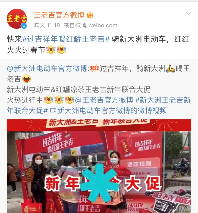 随着万物皆可联名,合作形式也愈发多样化,跨界合作的脑洞越来越大。近期,一场围绕着“过吉祥年,骑新大洲”为主题的的跨界营销引爆了市场。新大洲 x 王老吉强强联合,各自通过渠道、品牌、产品等多方位资源互补,开拓增量市场,并赋能行业高速发展。