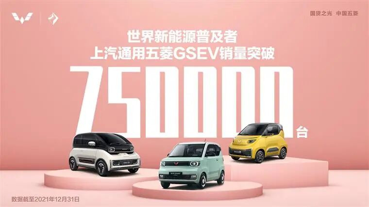据上汽通用五菱公布,截至2021年12月31日,上汽通用五菱GSEV的历史累计销量突破75万辆,这其中大部分销量贡献来自于宏光MINI EV,其累计销量达到了55万辆。2021年12月,宏光MINI EV销量达55729辆,连续16个月位居中国新能源车销量冠军。