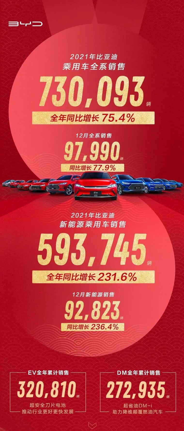 2021年,比亚迪乘用车全年销量730093辆,同比增长75.4%;其中新能源乘用车全年销量593745辆,同比增长231.6%。2021年12月,比亚迪乘用车销量达97990辆,同比增长77.9%;其中新能源乘用车销量92823辆,同比增长236.4%。