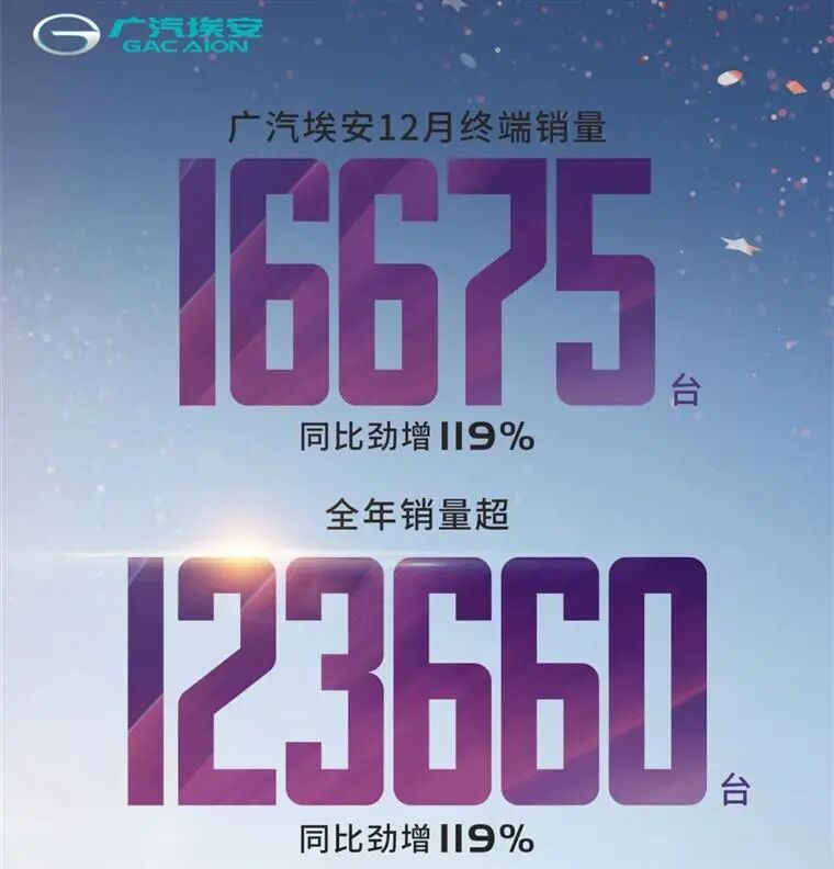2021年12月,广汽集团新能源乘用车销量19346辆,同比增长113.6%,其中,广汽埃安去年12月终端销量16675辆,同比增长119%。