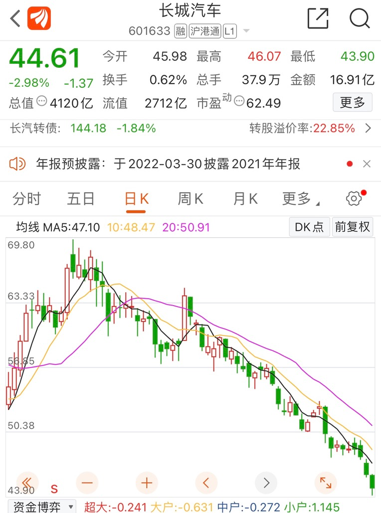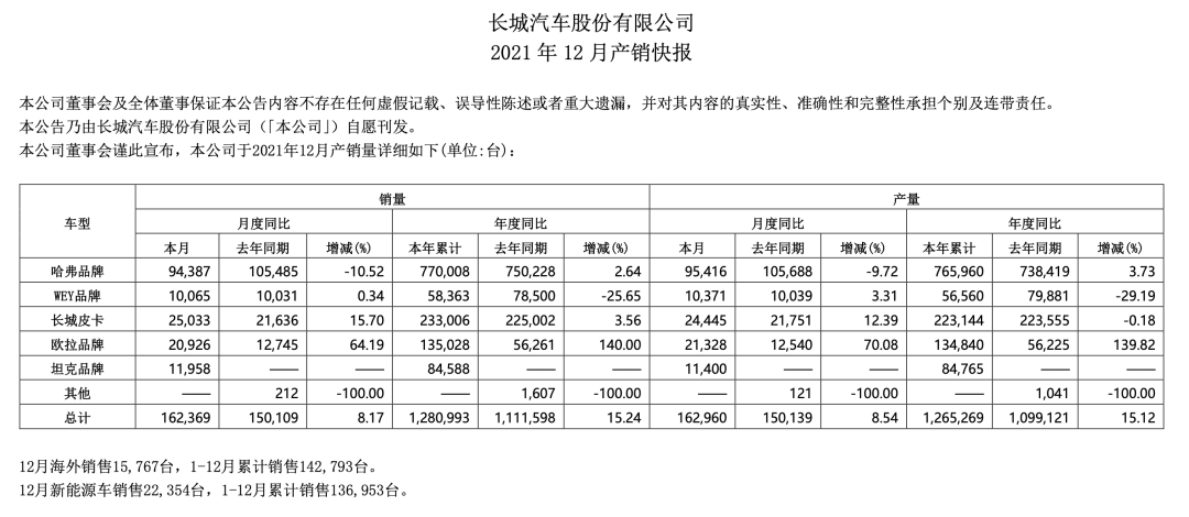 今日,沃尔沃公布2021年大陆汽车销量:171,393辆。为实现电气化战略目标,沃尔沃汽车将今年IPO资金70%用于电气化转型,30%将用于提高制造能力。沃尔沃汽车在2021年实现全面电气化,是豪华品牌中改革速度最快的。作为曾经的二线豪华品牌,如此激进的推动全系电动化;以及沃尔沃把今年IPO资金几乎全部使用在电气化战略来看,沃尔沃势必要成为电动豪华品牌。近日,长城汽车发布销量快报,全年销量达128万台。其中,新能源车型12月销量22,354台 ,1-12月累计销量136,953台。欧拉品牌占绝大多数,12月销售20,926台,全年累计销量135,028台。但长城的股价却遭遇“跌跌不休”,自从广州车展70块以来,一路跌到了44.61块。这不得不说让人有些出乎意料。股价只是代表资本和股民对这家企业的预期,并不能代表一家企业的销量和价值。所以这两者之间关系并不大。但主打女性市场的欧拉一个月能卖出两万台,说明欧拉在某些方面确实能够打动消费者。