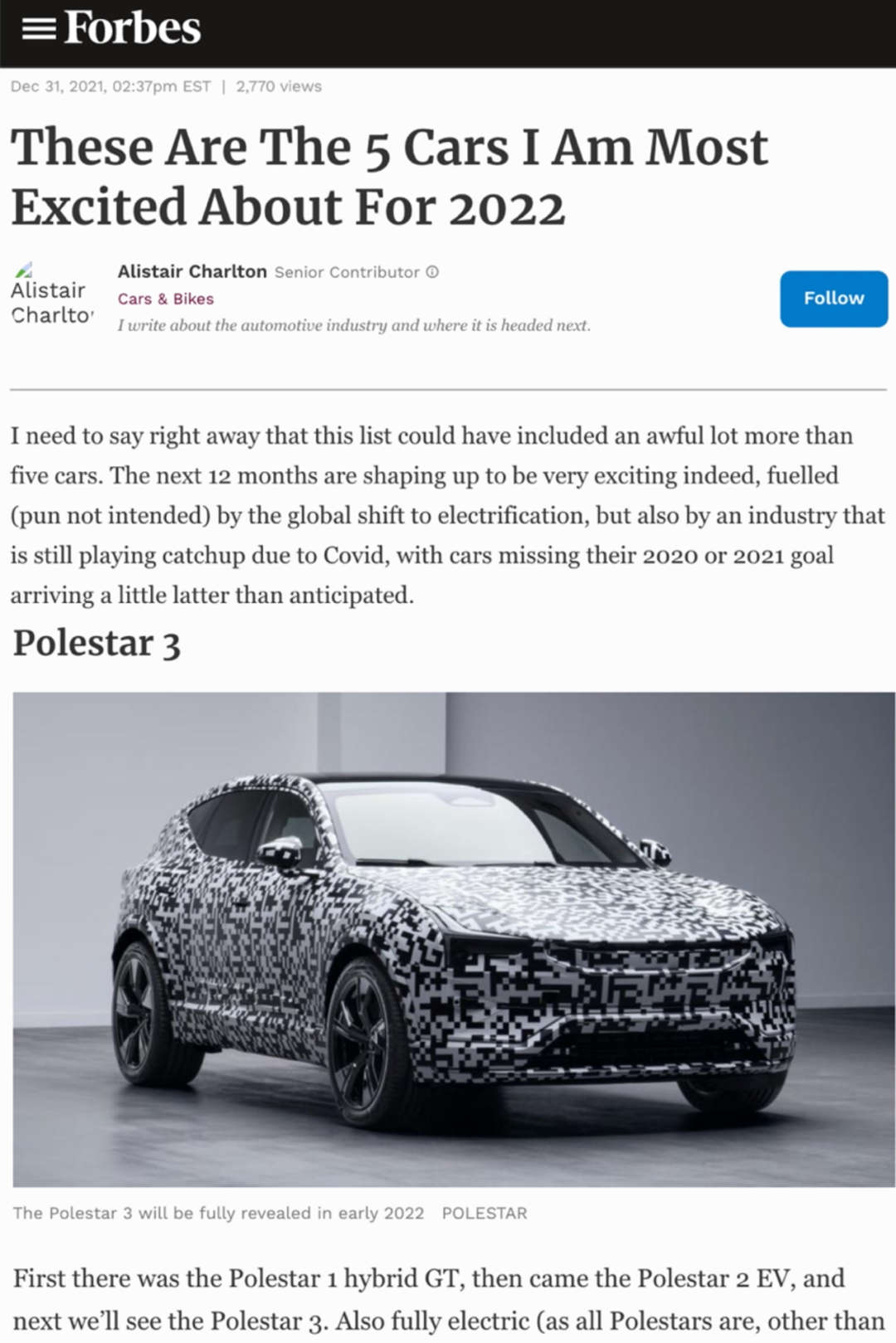 近日,凯迪拉克发布了Halo纯电自动驾驶概念汽车。其搭载的Ultra Cruise辅助驾驶系统,将于2023年投产。概念车支持350kW的直流快充,充电10分钟可补充160公里续航、同时还可“对外放电”。通用汽车副总裁表示:“2025年前,将推出30款电动车,其中超过三分之二的车型将会引入中国市场。”超过半数的车引入中国市场,可以看出中国市场的强大。凯迪拉克想要在电动豪华品牌取得一席之地,中国市场已经成为不可忽视的一个重要市场。近日,宝马亮相了数字化成果——“电子墨水”。“电子墨水”中包含数百万个透明微胶囊,通过控制微胶囊两侧的电极,可使所需颜色出现在车身表面上。宝马集团负责人表示,“希望用户能够有自己定制车辆的能力,而不是被动接受厂商的产品。”如今,很多的厂家已经牢牢抓住了消费者希望差异化的心里,不断推出新的配色、皮肤。宝马所做的不再是厂商给用户差异化的产品,而是让用户自己设计差异化产品,这在汽车行业是一个全新的消费理念。近日,索尼宣布正式成立移动出行公司,并且发布了VISION-S 02全新概念SUV。索尼负责人曾经在接受采访时说过,索尼不会成为汽车制造商,而是致力于成为汽车产业变革的推动者。但现在看来,索尼是啪啪打脸了。作为电子产品行业大佬,手握多个产品专利,自身造车的优势比较明显,自己干是不是才会把自身优势发挥到最大呢?近日,由百度牵头、多家机构共同起草的《自动驾驶公交车》系列团队标准正式发布。与此同时,2021年4月,百度自动驾驶公交在重庆试运营3辆车;7月,河北沧州同样试运营3辆车;8月,上海启动载人示范应用;9月将在广州开通6条自动驾驶便民线路,50台自动驾驶车辆。随着技术安全标准的日益完善,自动驾驶出行的保障日益增加。随着越来越多的自动驾驶公交车进入市场,为保障行人、乘客和司机们的安全,行业的规则会日益完善以及严格。近日,《福布斯》评选2022年最值得期待的5款新车。豪华高性能纯电动SUV极星3上榜。极星3将基于全新一代沃尔沃电动车平台架构打造,车载娱乐系统速度得到大幅提升,将于2022年正式发布上市。极星3作为首款中国美国同时生产的SUV,在合作方面以及全新电动化平台架构,硬件软件方面都有创新。并且SUV在美国占据新车销量一半,中国占据新车销量40%以上。极星在SUV方面发力,看来找对跑道了!近日开幕的CES 2022电子消费展上,NVIDIA汽车部门副总裁介绍了公司在自动驾驶车辆和无人驾驶汽车方面,很多公司采用其开放式DRIVE Hyperion平台。在2022 CES展期间,Mobileye也发布了最先进的EyeQ Ultra自动驾驶芯片,算力176 TOPS,2024年底量产。据官方表示,EyeQ Ultra能够以合理的成本提供自动驾驶汽车所需的性能。近几年来,越来越多的车企在CES大会上展示自家的新科技,新技术。像NVIDIA等公司就在大会上推出了新的芯片来满足不同厂商的需求。目前的CES也越来越百花齐放,成为很多品牌争相秀肌肉的 “春晚”舞台。
