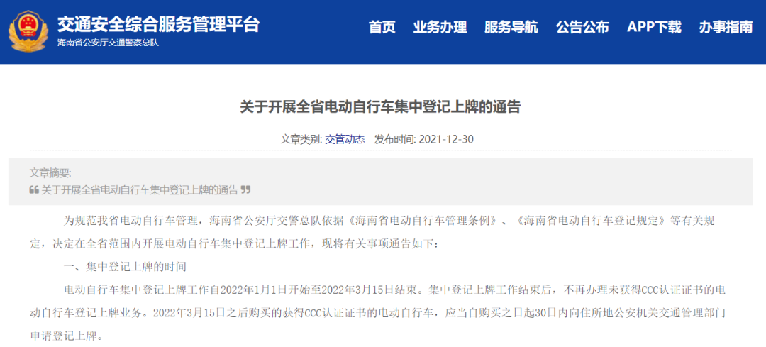 据了解,《海南省电动自行车管理条例》2022年1月1日起实施。为预防交通事故,规范电动自行车通行秩序,通知要求各地交警,要针对本辖区电动自行车通行规律和多发违法行为,强化电动自行车现场执法力度,一并加强摩托车的整治,严格查处不按车道行驶、闯红灯、逆向行驶、酒驾、不戴安全头盔等交通违法行为,特别要加大对未满十六周岁人员骑行摩托车、骑行电动自行车载人等违法行为的查处力度。