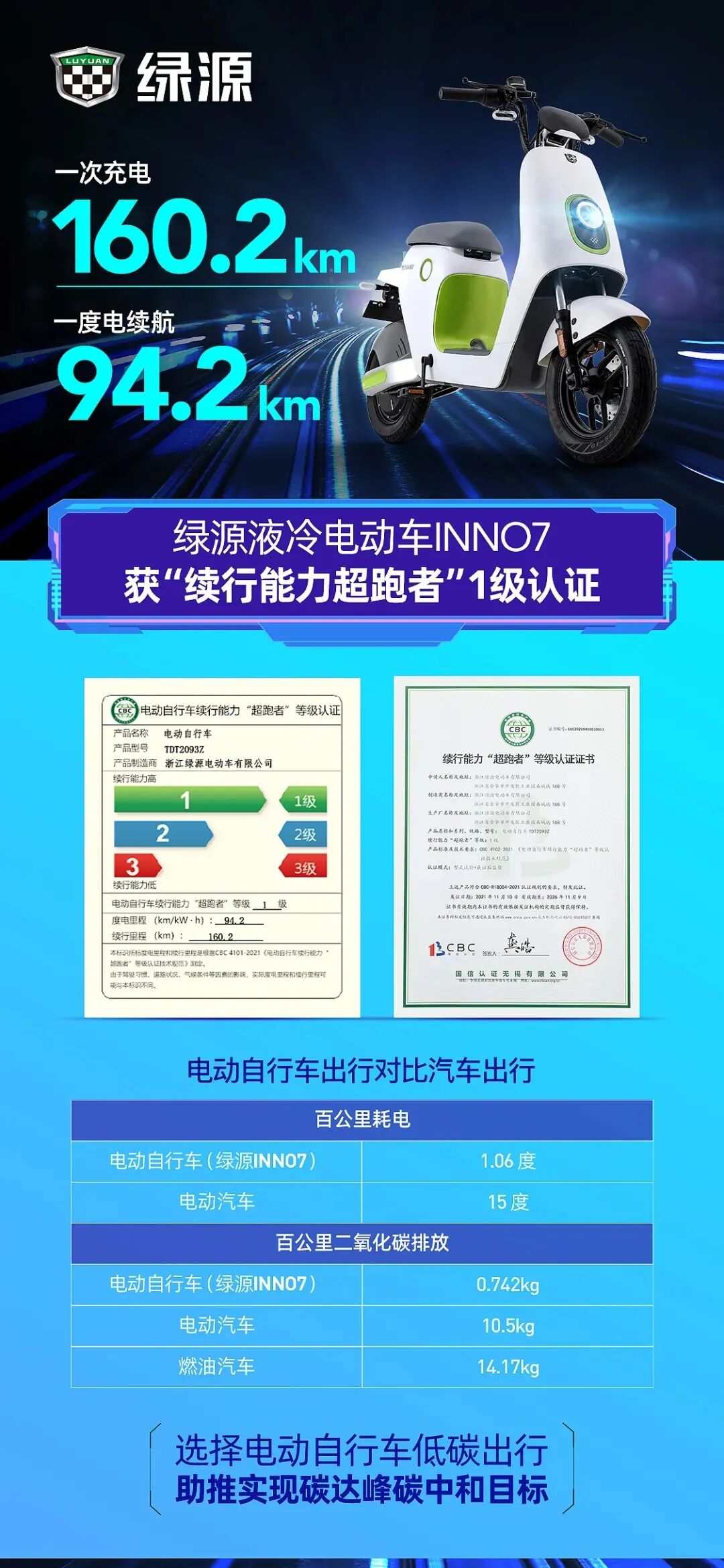 11月,经过无锡市产品质量监督检验院的专业测试,CBC国信认证无锡有限公司权威认证,绿源INNO7液冷超续航版获得续行能力“超跑者”等级1级认证证书——一度电续航94.2km,一次充电续航160.2km!(搭载48V30Ah锂电,整车质量≤55公斤,符合电动自行车国家标准)刷新了电动自行车度电续航里程及一次充电续航里程记录!