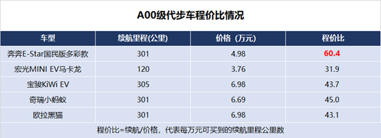 但不容忽视的是,代步车市场的竞争依然十分激烈,据乘联会的统计,仅仅是2021年10月一个月,A00级纯电动车的批发量为9.4万辆,可以说每一个玩家都压力山大。打出多彩牌,只是奔奔E-Star国民版的其中一招,在产品力方面,这款产品同样值得一说。奔奔E-Star国民版多彩款的硬实力是程价比。和同级别的MINI EV,宝骏KiWi EV,奇瑞新能源小蚂蚁等车型相比,奔奔E-Star国民版多彩款程价比最高。![]()