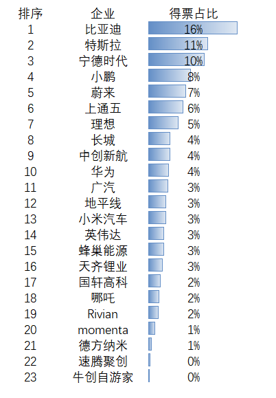 快要过年了,又到了年度大攀比的时节。哪些企业老板会在酒桌上声音比较大,底气比较足呢?《电动汽车观察家》选择了20家2021年表现不错的新能源汽车企业(包括供应商),在读者群里进行了一次网友投票,请他们投出2021年最得意的十大企业。投票结果如下:下面我们按得票多少,逐个盘一盘这些企业的2021都有啥精彩之处。2021年,比亚迪将再次登顶中国新能源销量冠军宝座。2013-2020年,比亚迪连续八年位居中国新能源汽车销量冠军。今年比亚迪凭借插混DM-i车型,在插混车型市场风生水起。从上险数据看,比亚迪插混和纯电车型各占一半,是两条路线都非常成功的企业。突飞猛进的还有比亚迪的市值,从2020年的1500亿涨至今年的年底的7800亿,目前仅次于特斯拉和丰田汽车,跻身全球上市车企市值“前三甲”。横跨储能、电池、电动汽车、芯片等诸多万亿级市场的比亚迪,正在加快核心零部件的外销和上市节奏。尽管争议缠身,但特斯拉的交付量依然惊人。2021全年,特斯拉累计全球交付量93.6万辆。支撑销量的王牌产品变成了——Model 3、Model Y。Model Y甚至已经超越Model 3成为屠榜的畅销车型。特斯拉上海工厂也开始正式向海外交付车辆;特斯拉已经实现90%以上供应链本土化……一切仍然进展顺利。拥有中国动力电池50%、全球1/3市占率,中国新能源汽车发展的最大赢家当属宁德时代。2021年,宁德时代的股价持续上涨一度逼近700元,公司市值也一度突破1.6万亿元,短短一年,市值迅速攀升了8000亿元。7月份,在锂价不断上涨的情况下,宁德时代抛出了钠离子电池技术,通过与锂离子电池的混搭,应用在电动汽车上,这为车企和电池企业减少对锂依赖带来了希望。2021年,也是宁德时代扩产和投资大年。8月,宁德时代抛出了582亿元的再融资计划,尽管遇到一些争议,但和公司超过万亿的市值相比,股权的稀释比例并不大。11月,在遭遇监管部门的询问后,宁德时代否认了“过度融资”,并将融资额调整为不超过450亿元。此外,宁德时代的还将版图拓展至换电领域、能源领域、汽车底盘等领域,这为后期发展也带来无限遐想。今年11月,小鹏汽车已经连续三月月度交付量破万,最高月度交付量达1.56万辆,同比大涨270%,位列造车新势力阵营之首,曾经的“蔚小理”正在渐渐变为“小蔚理”。回顾小鹏汽车的2021年,小鹏G3i上市、小鹏P5上市,小鹏G9亮相广州车展;香港联交所挂牌上市;第10万辆整车正式下线;一季度小鹏确认了来自XPILOT自动驾驶软件的收入……无论是产品还是企业,2021年小鹏汽车均出现不少历史性时刻。作为国内首家尝试全栈自研的智能电动车企,智能化正在给这家车企带来更大的红利。2021年,蔚来发布基于全新平台的旗舰轿车ET7和直接对标特斯拉Model 3的中级轿车ET5。2021年蔚来最得意的事情,应该是NIO Day上发布的ET5,火爆的预订,瞬间挤崩了APP。当然,在国际上蔚来也有所斩获:2021年蔚来首次进入挪威市场,开启了自己的全球化元年。在换电站方面,NIO POWERDAY上,蔚来将2021年换电站建成目标总数由500座提升为700座,并在年底提前完成。虽然蔚来今年没有太大的动作,但是按照蔚来创始人、董事长兼CEO李斌接受采访时的话说,“今年开始才有机会真真正正重新做回自己,包括投入做换电站和牛屋(NIO House)。”宏光mini EV毫无疑问的年度最畅销电动车型,也帮助上汽通用五菱成为中国纯电动车企的NO.1。这家中国汽车制造商的全球销量增长纪录,每隔30天,就会被刷新一次。今年11月,该车型更是凭借45576辆的销量,连续15个月成为中国新能源汽车市场销售冠军,目前整体销量超过50万辆。上汽通用五菱的成功引来了更多的模仿者,这对他们来说,也算是一种赞美。理想凭借唯一一款车型理想ONE成为细分市场中月销量和年销量的双料冠军。11月交付了13485辆的理想ONE,终于在倒数第二个月达成了交付过万,位列当月中大型SUV销量排行榜榜首,把BBA甩在了后头。理想汽车也是继小鹏汽车之后,又一家在美股、港股均实现上市的“造车新势力”企业。2021年,长城的新能源汽车销量也踏入了10万辆车企俱乐部。深谙品类创新之道的长城,用欧拉猫系列产品迅速占领年轻女性消费者的心智,市场销量大幅增长。长城还在年底发布了新品牌“沙龙”,并亮相首款车型“机甲龙”。沙龙品牌的定位是一个全新的汽车流派——机甲科技品类。通过欧拉和沙龙,使得长城在低端、中端、高端市场的布局更加完善。在技术层面,长城坚持氢电两条腿走路,电池、电控、智能化等领域多线布局,其孵化出的蜂巢能源开启上市之路,并站稳中国电池企业十强地位。不可否认,在智能电动汽车时代,长城也已经打下了不错的基础。擅长打“性别”牌的长城,明年还将把谋划已久的插混技术大规模推向市场。长城的进阶之势,还在持续。2021年,筹划上市的中创新航高调了许多,装机量已经坐稳中国前三甲。产能建设也很激进,继6月1日,“全球合作伙伴大会”公布了产能规划5个月后,中创新航再次拓展了其产能规划,2025年的产能由300GWh提升至500GWh;2030年预计做到1TWh。这应该是首个公布TWh产能规划的电池企业。这个撬了“宁王”客户,又被“宁王”以知识产权起诉的企业,今年也赚了不少眼球。“不造车”的华为,几乎每一个动作都让车界关注。刚刚推出的问界M5车型,让华为离造车更进一步。非造车业务,进展也很不错。在过去的一年
