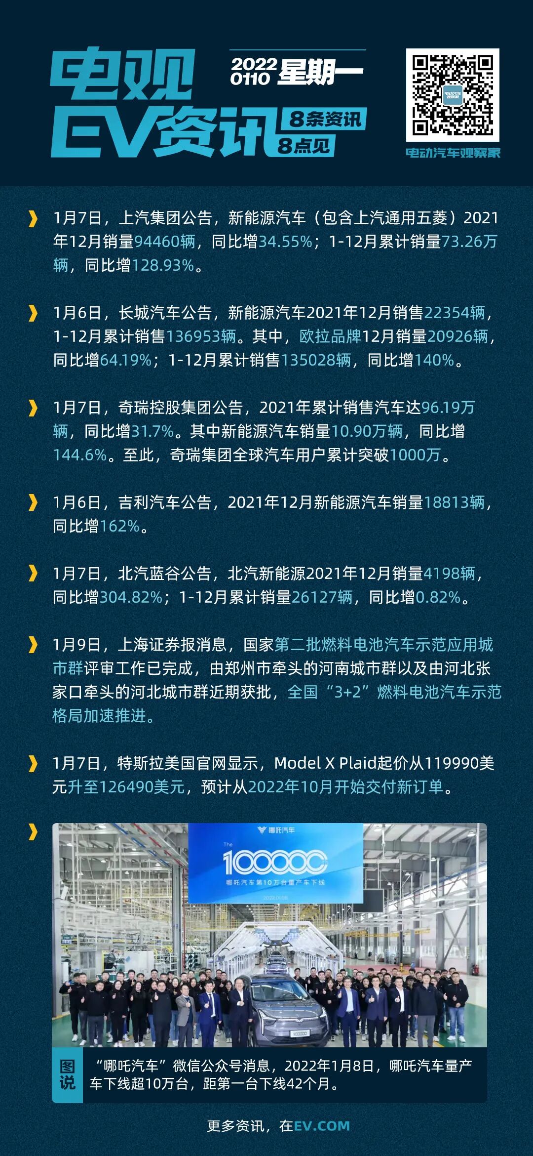 ■1月7日,上汽集团公告,新能源汽车(包含上汽通用五菱)2021年12月销量94460辆,同比增34.55%;1-12月累计销量73.26万辆,同比增128.93%。■1月6日,长城汽车公告,新能源汽车2021年12月销售22354辆,1-12月累计销售136953辆。其中,欧拉品牌12月销量20926辆,同比增64.19%;1-12月累计销售135028辆,同比增140%。■1月7日,奇瑞控股集团公告,2021年累计销售汽车达96.19万辆,同比增31.7%。其中新能源汽车销量10.90万辆,同比增144.6%。至此,奇瑞集团全球汽车用户累计突破1000万。■1月6日,吉利汽车公告,2021年12月新能源汽车销量18813辆,同比增162%。■1月7日,北汽蓝谷公告,北汽新能源2021年12月销量4198辆,同比增304.82%;1-12月累计销量26127辆,同比增0.82%。■1月9日,上海证券报消息,国家第二批燃料电池汽车示范应用城市群评审工作已完成,由郑州市牵头的河南城市群以及由河北张家口牵头的河北城市群近期获批,全国“3+2”燃料电池汽车示范格局加速推进。■1月7日,特斯拉美国官网显示,Model X Plaid起价从119990美元升至126490美元,预计从2022年10月开始交付新订单。■图说:“哪吒汽车”微信公众号消息,2022年1月8日,哪吒汽车量产车下线超10万台,距第一台下线42个月。2022电观大会顺利闭幕,错过直播的朋友可以扫描二维码看直播回放,或者复制下面地址到浏览器观看:https://mudu.tv/live/watch/general?id=o9rn288o