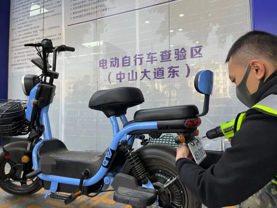 “市民朋友在网上审核通过后即可预约到网点上牌。”广州交警表示,在现场上牌时还会重点对电动自行车进行实车查验,查验员严格按照新国标认真查验CCC认证证书、脚踏功能、外形尺寸、整车质量等信息,核对编码拓印膜,并对改装车架、避震、座椅和加装货架等问题进行严格把关。电动自行车登记上牌工作开展以来,经现场查验审核不通过的车辆约2500辆。