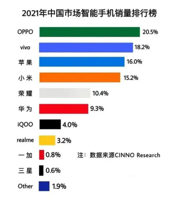 据CINNO统计,2021年全年魅族手机在国内的市场份额仅0.1%不到,只能沦入“Other”里了。
