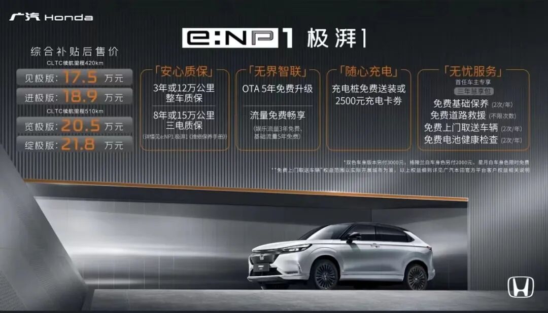 6月20日,广汽本田e:NP1极湃1正式上市,综合补贴后售价区间为17.5-21.8万元,提供CLTC续航420km和510km两个版本。
