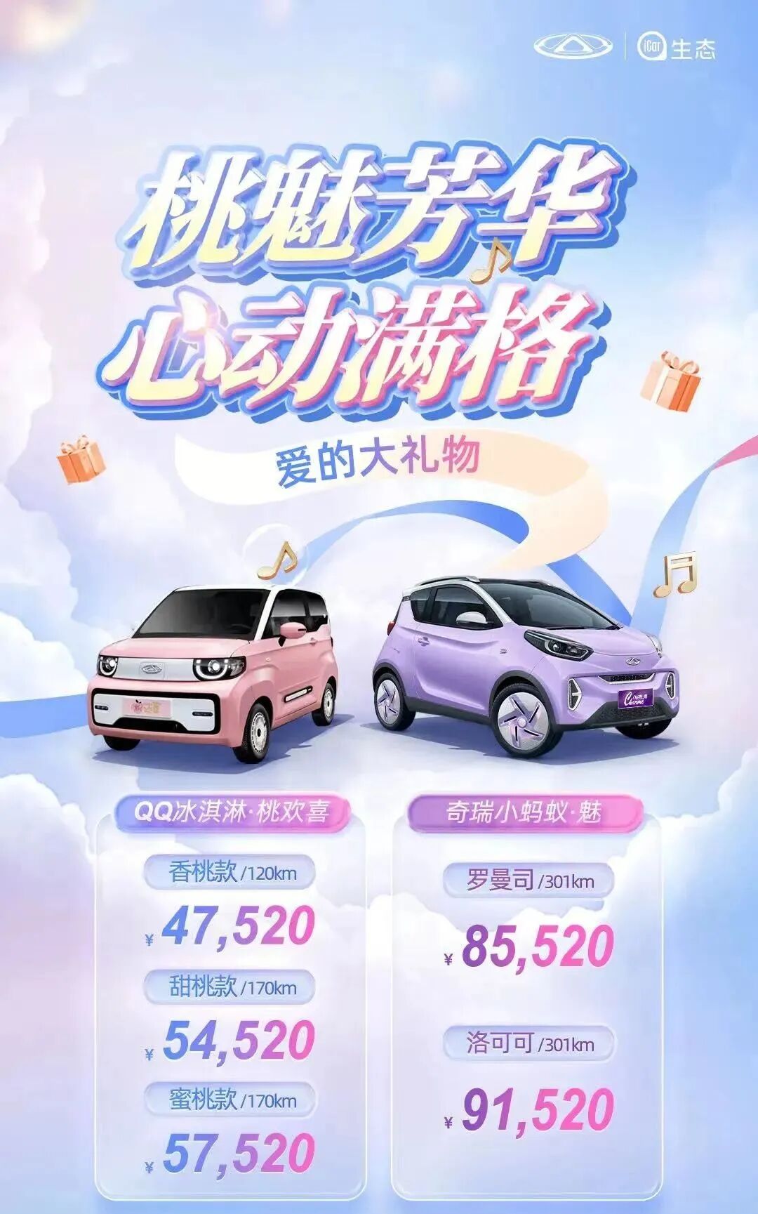 6月21日,奇瑞QQ冰淇淋·桃欢喜&小蚂蚁·魅双车上市。桃欢喜共3款车型,售价区间为4.752-5.752万元;小蚂蚁·魅共2款车型,售价区间为8.552-9.152万元。