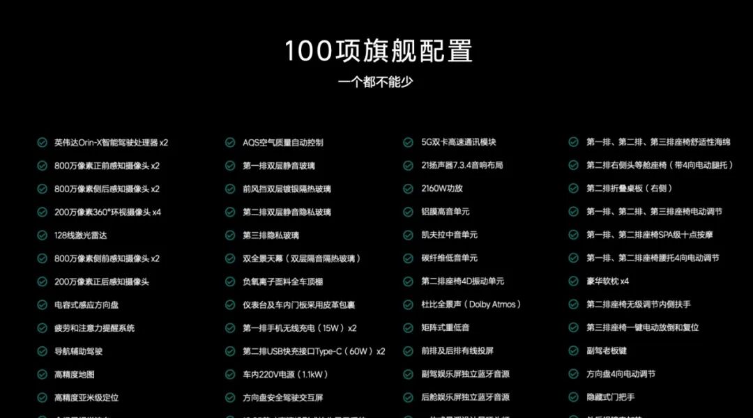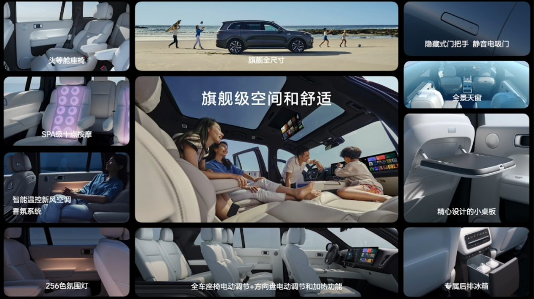 作为一款主打家庭场景的车,理想L9内部采用2+2+2的6座布局设计。座椅不仅采用Nappa真皮材质,并且6个座椅均配备电动调节和座椅加热,前两排的4个独立座椅拥有座椅通风和十点按摩,专属设计的右侧二排座椅还配备四向电动腿托。此外,车内还配备小桌板、冷藏加热双用后排冰箱,冰箱在车辆下电后还能工作24小时。