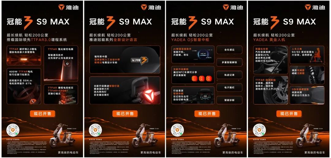 当下的中国正迎来一个消费升级的全新时代,对处于全球电动两轮产业金字塔顶端的雅迪来说,始终坚持依托尖端科技实力,不断为用户提供更加高效和智慧的绿色骑行解决方案、让亿万人享受美好出行。本次发布会,雅迪推出了冠能3 S9 、E9、Q7等车型,搭载多项黑科技国际领先TTFAR3.0增程系统以及YADEAOS智慧中枢、冠能系列全新设计语言,在智慧、美学、舒适、品质等方面为用户带来了焕然一新的出行体验。其中,雅迪冠能3 S9 MAX作为业界首个轻松续航200公里的新国标电动自行车,打破了以往电自续航短、动力差的瓶颈,引领整个行业新国标电自进入续航200公里的时代。可以预判的是,未来在新国标电自续航200公里的维度,必然会涌入更多的模仿者,但毋庸置疑的是,雅迪已经抢占了先机和制高点,并且还将不断加大研发力度,深化在核心科技领域的绝对话语权,以一马当先的领军姿态成为不可被超越的神话。众所周知,雅迪冠能系列凭借卓越的产品性能风靡全球,2021年9月,全球销量超300万台,被全球著名增长咨询公司弗若斯特沙利文正式认定为“长续航市场全球销量第一”;而在雅迪冠能3上市前,雅迪冠能系列再创新高,全球销量超700万台,足可见该系列产品在全球的受欢迎度。如今,雅迪冠能3重磅登场,备受全球市场看好,全网预售订单直接突破5万单,奠定了更大规模热销的基础!